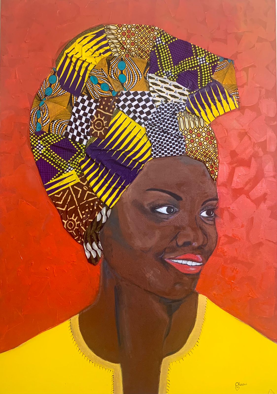 الوجه المبتسم والذي ينظر في اتجاه آخر ذو البشرة السوداء وحده كاف لامتاع الذائقة البصرية وإن كنا في وهم التقاط جنس محيا الصورة لاننا في لحظة نراه امرأة لكن التأمل الدقيق فيه مؤشرات كونه رجلا ،وان كانت الشفاه حمراوتان فهذا لآ يعني أنه وجه امرأة،،،هذا موضوع آخر يترك للتاويل العميق ،لكننا امام لوحة فيها كرنفال الألوان التي تحيلنا إلى الثقافة الأفريقية حيث يحضر الاصفر بقوة والبرتغالي،والاسود والبنفسجي،وهذا ما التزمت به فنانتنا وهي تحيك بفرشاتها ملامح هذا الوجه.