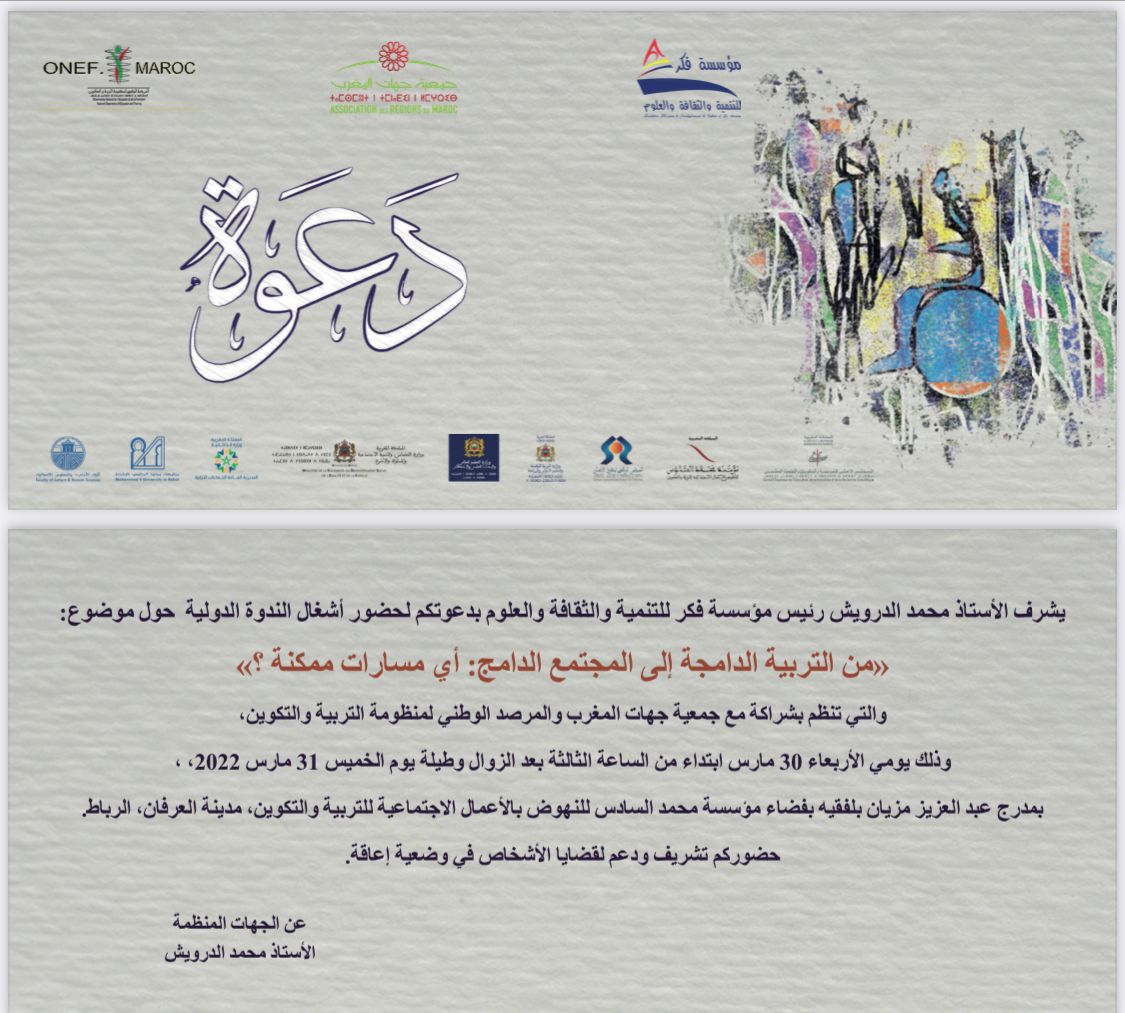في إطار أنشطتها التفافية والاجتماعية تنظم مؤسسة فكر للتنمية والثقافة والعلوم بشراكة مع جمعية جهات المغرب والمرصد الوطني لمنظومة التربية والتكوين ندوة دولية في موضوع ( من التربية الدامجة الى المجتمع الدامج : اي مسارات ممكنة . ودالك يومي الأربعاء والخميس 30و31 مارس 2022 يحتضن الندوة مدرج عبد العزيز مزيان بلفقيه بفضاء مؤسسة محمد السادس للنهوض بالأعمال الاجتماعية للتربية والتكوين مدينة العرفان الرباط ويتضمن برنامج الندوة الفقرات التالية :