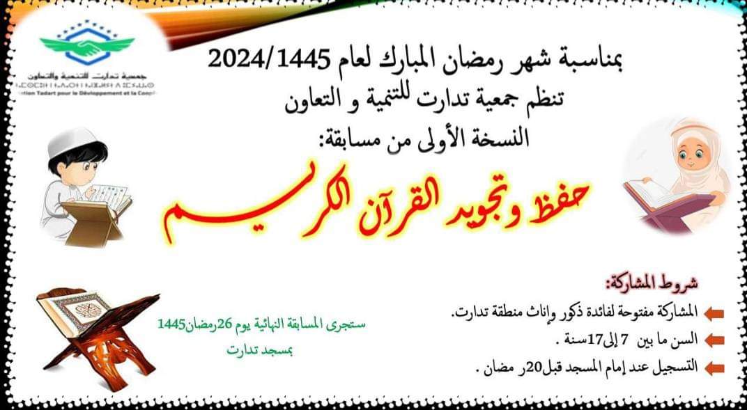 بمناسبة شهر رمضان المبارك لعام 2024/1445 ، تنظم جمعية تدارت للتنمية والتعاون النسخة الأولى من مسابقة في حفظ وتجويد القرآن الكريم بمسجد تدارت جماعة أنزي إقليم تيزنيت، وذلك يوم 26 رمضان 1445.