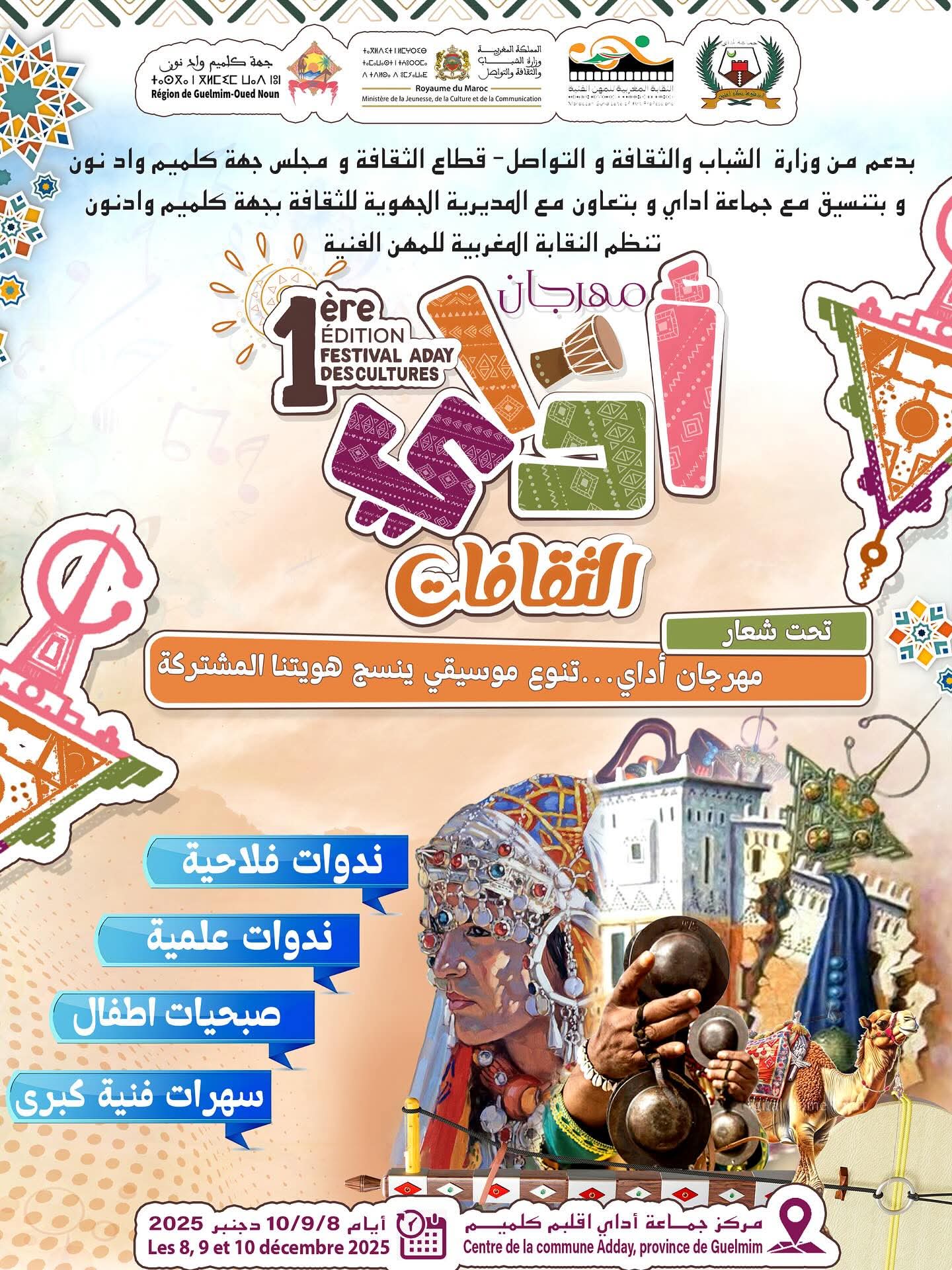 تعلن إدارة مهرجان أداي الثقافات، بشراكة مع وزارة الشباب والثقافة والتواصل – قطاع الثقافة، وبدعم من مجلس جهة كلميم وادنون، وبتنسيق مع جماعة أداي، وبالتعاون مع المديرية الجهوية للثقافة بجهة كلميم وادنون، عن تنظيم الدورة الأولى من مهرجان أداي الثقافات، وذلك في إطار تثمين التراث المحلي، وتعزيز الإبداع الفني، وترسيخ قيم التعدد الثقافي التي تميز المغرب.
