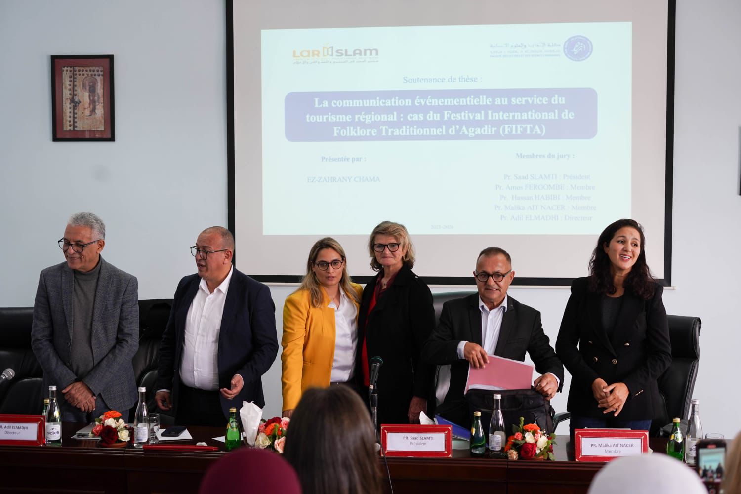 وضمّت لجنة المناقشة نخبة من الأساتذة الجامعيين، برئاسة الأستاذ سعد سلامتي (كلية الآداب والعلوم الإنسانية، جامعة ابن زهر، أكادير)، وإشراف الأستاذ عادل المديحي (الكلية ذاتها)، وعضوية الأستاذ حسن حبيبي (كلية الآداب والعلوم الإنسانية عين الشق، جامعة الحسن الثاني، الدار البيضاء)، والأستاذ آموس فيرغومب (الجامعة البوليتكنيكية – فرنسا)، والأستاذة مليكة آيت ناصر (كلية العلوم القانونية والاقتصادية والاجتماعية، جامعة ابن زهر، أكادير).