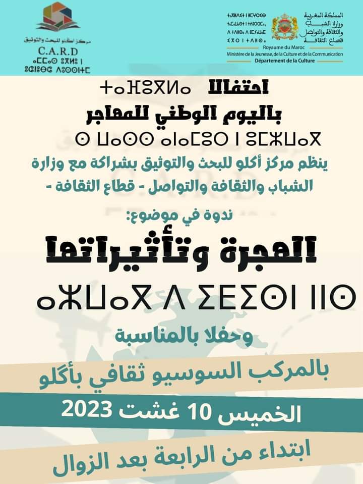 بمناسبة اليوم الوطني للمهاجر ، ينظم مركز أكلو للبحث والتوثيق بشراكة مع وزارة الشباب والثقافة والتواصل – قطاع الثقافة – ندوة في موضوع : “الهجرة وتأثيراتها”.