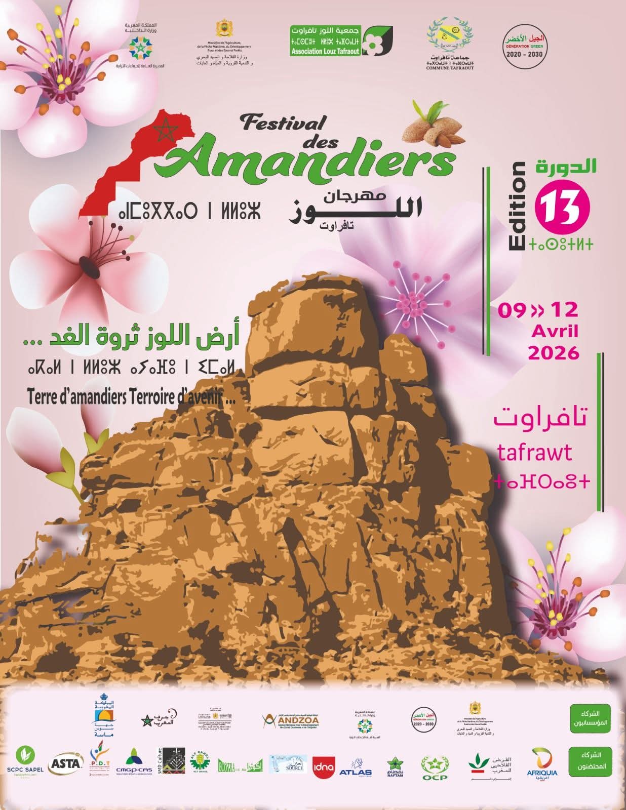 تنظم جمعية اللوز تافراوت، بشراكة مع وزارة الفلاحة والصيد البحري والتنمية القروية والمياه والغابات، وكتابة الدولة المكلفة بالصناعة التقليدية والاقتصاد الاجتماعي والتضامني، وعمالة إقليم تزنيت، وجماعة تافراوت، إلى جانب عدد من الشركاء المؤسساتيين والخواص، الدورة الثالثة عشر من مهرجان اللوز ، وذلك خلال الفترة الممتدة من 09 إلى 12 أبريل 2026 . تحت شعاره الدائم: "أرض اللوز.. ثروة الغذ"