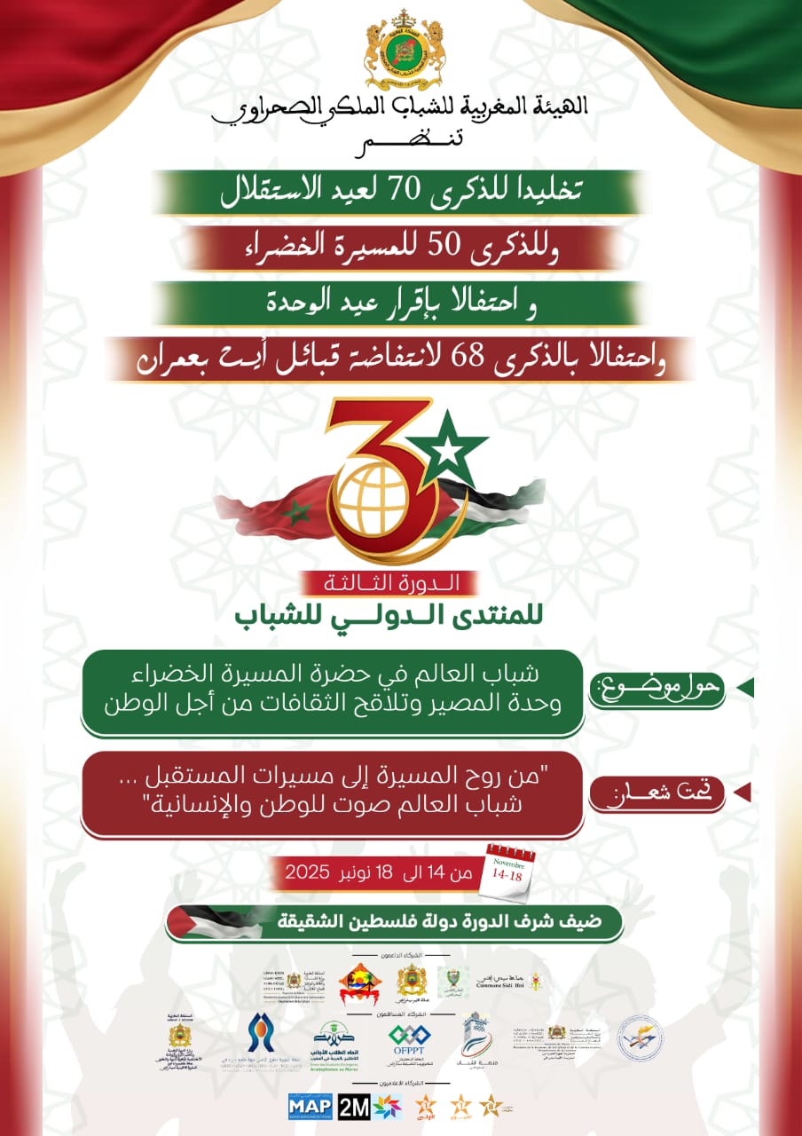 تنظم الهيئة المغربية للشباب الملكي الصحراوي بشركة مع مجلس جهة كلميم واد نون ووزارة الشباب والثقافة والتواصل -قطاع الثقافة- ومجلس جماعة سيدي افني فعاليات الدورة الثالثة للمنتدى الدولي للشباب، بمدينة سيدي إفني، جهة كلميم واد نون، تحت شعار "من روح المسيرة إلى مسيرات المستقبل... شباب العالم صوت للوطن والإنسانية"، وذلك في الفترة الممتدة من 14 إلى 18 نونبر 2025.