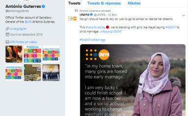 Antonio Guterres (SG des Nations-Unies) tweete sur le message d'Hayat Outemma contre le mariage d'enfants