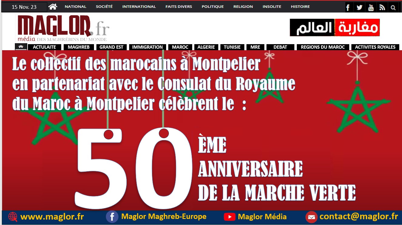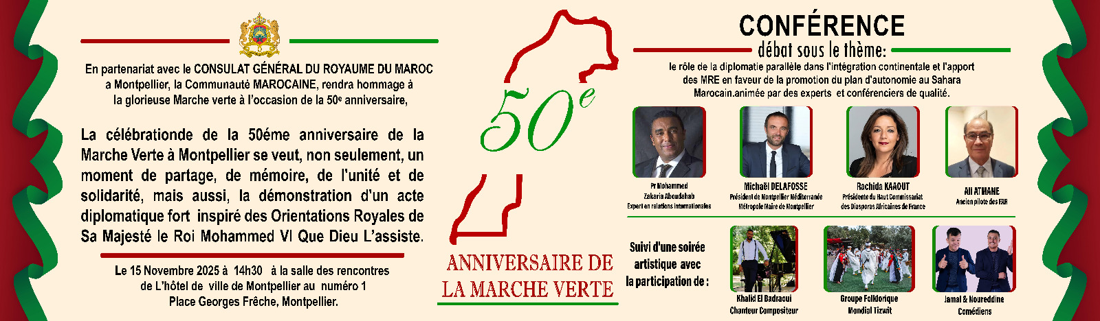 Maglor - À l’occasion du cinquantenaire de la Marche Verte, le Collectif des Marocains ACCM, en partenariat avec le Consulat Général du Royaume du Maroc à Montpellier, organise une célébration patriotique et culturelle le 15 novembre 2025, à la salle des Rencontres de l’Hôtel de Ville de Montpellier.