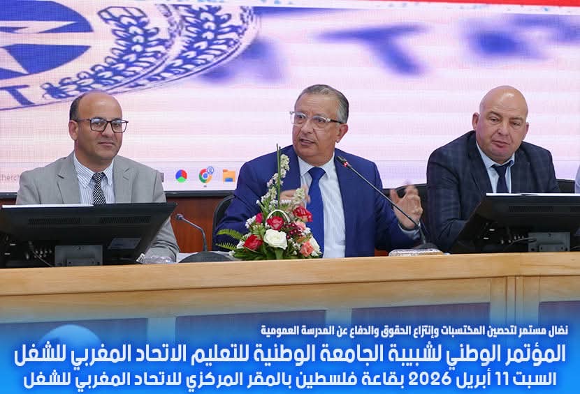 احتضنت قاعة فلسطين بالمقر المركزي للاتحاد المغربي للشغل، يوم السبت 11 أبريل 2026، حدثاً نقابياً استثنائياً، حيث تحولت القاعة إلى مسرح لـ"عرس نضالي" بمناسبة انعقاد المؤتمر الوطني الأول لشبيبة التعليم، التابعة للجامعة الوطنية للتعليم المنضوية تحت لواء الاتحاد المغربي للشغل.