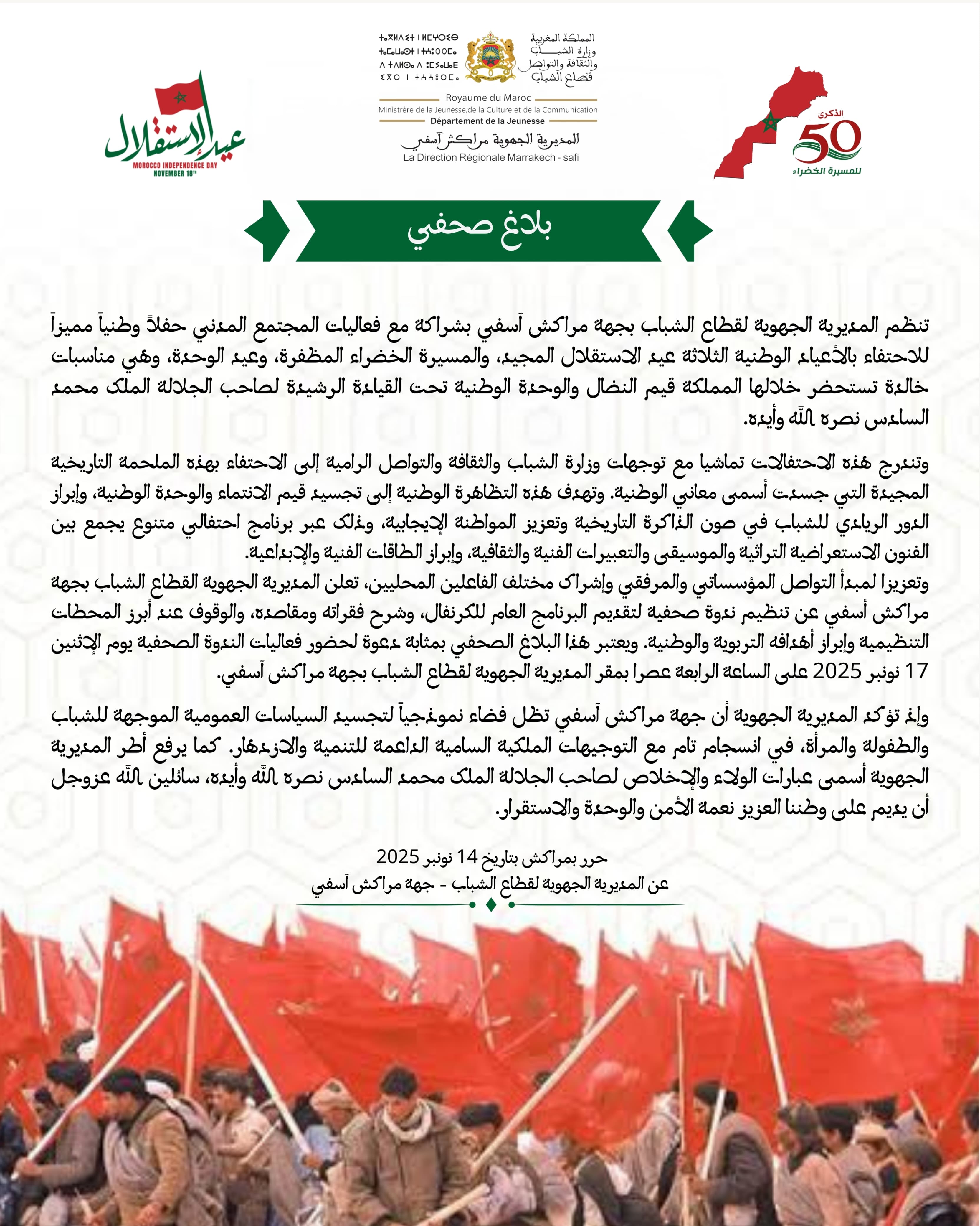 تنظم المديرية الجهوية لقطاع الشباب بجهة مراكش آسفي بشراكة مع فعاليات المجتمع المدني حفلاً وطنياً مميزاً للاحتفاء بالأعياد الوطنية الثلاثة عيد الاستقلال المجيد، والمسيرة الخضراء المظفرة، وعيد الوحدة، وهي مناسبات خالدة تستحضر خلالها المملكة قيم النضال والوحدة الوطنية تحت القيادة الرشيدة لصاحب الجلالة الملك محمد السادس نصره الله وأيده.