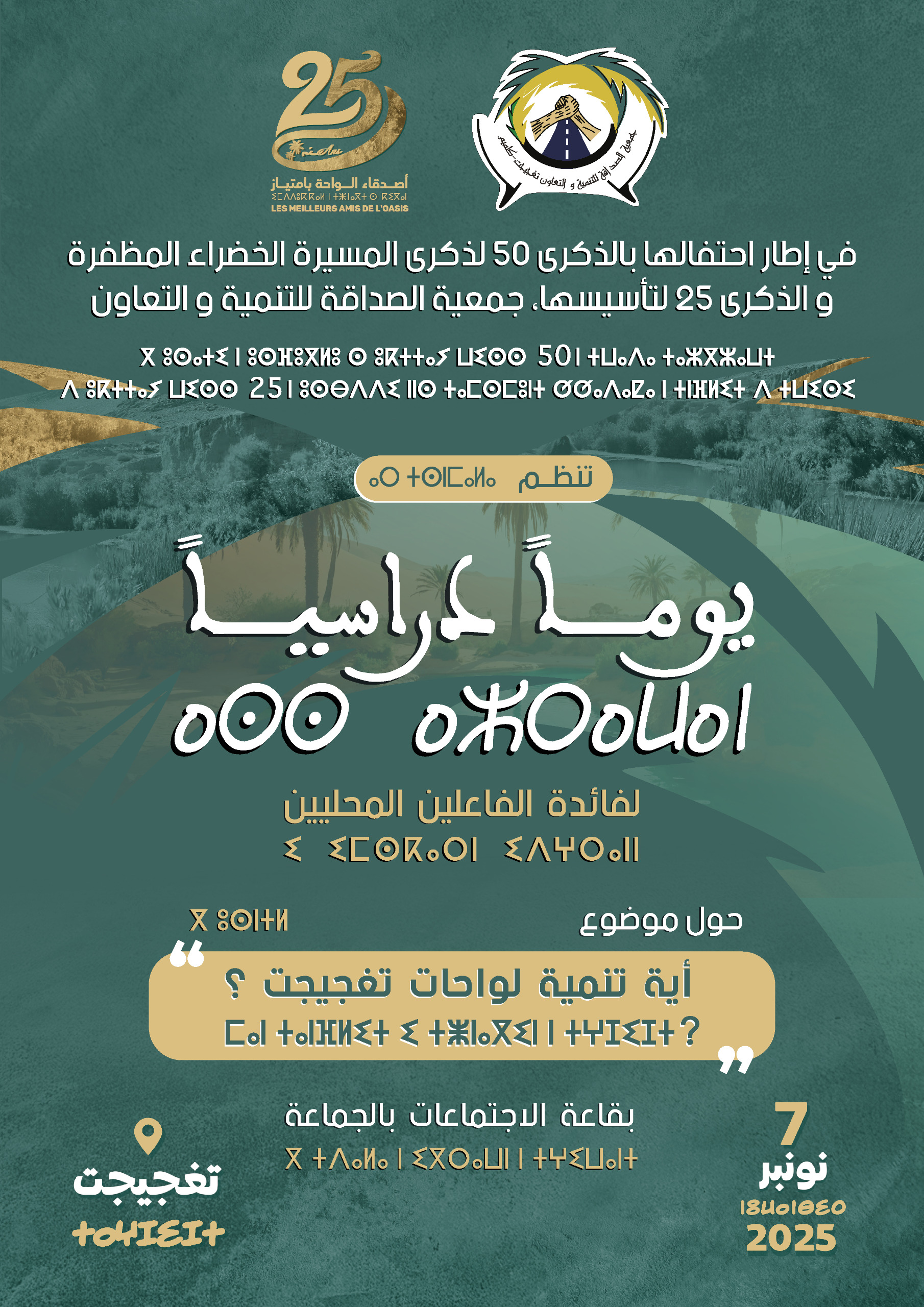 احتفاءً بالذكرى الخمسين للمسيرة الخضراء المظفرة، وبمناسبة الذكرى الخامسة والعشرين لتأسيسها، تنظم جمعية الصداقة للتنمية والتعاون بتغجيجت يوماً دراسياً حول موضوع :