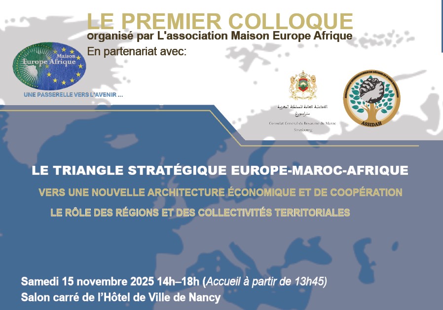 Nancy, 15 novembre 2025 – Maglor - Le Maroc sera au cœur des échanges ce samedi à l’Hôtel de Ville de Nancy, où se tiendra le premier colloque thématique de l’association Maison Europe Afrique, consacré au thème : « Le triangle stratégique Europe–Maroc–Afrique : vers une nouvelle architecture économique et de coopération ».