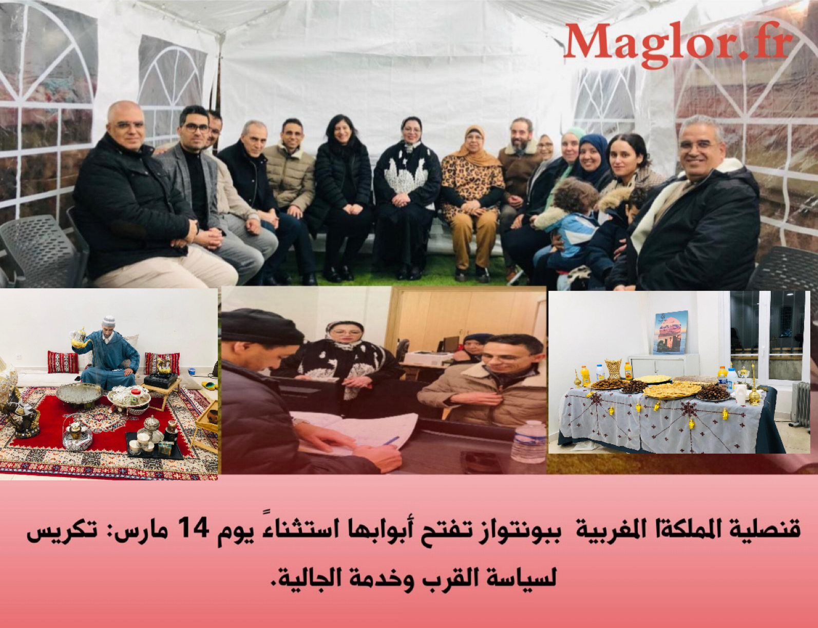 المصطفى قبلاني. تجسيداً لمفهوم الخدمة المواطنة وسياسة القرب التي تنهجها الدبلوماسية المغربية، وتفعيلاً للمبادرة الشاملة التي تنخرط فيها كافة القنصليات العامة للمملكة المغربية الشريفة بفرنسا تحت إشراف سفيرة جلالة الملك بباريس، تعلن القنصلية العامة ببونتواز عن فتح أبوابها بشكل استثنائي يوم السبت 14 مارس 2026، من الساعة العاشرة والنصف صباحاً (10:30) إلى غاية الساعة الواحدة والنصف زوالاً (13:30).