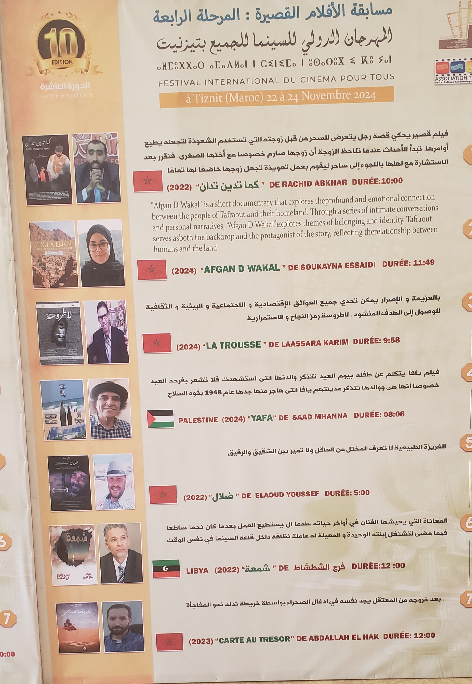 هذا العام، تشارك 30 فيلمًا قصيرًا في المسابقة، من بينها 15 فيلمًا مغربيًا، تم اختيارها بعناية لتُعرض أمام جمهور المهرجان ولجنة التحكيم. تتنوع موضوعات هذه الأفلام لتتناول قضايا اجتماعية وإنسانية وبيئية، مع تركيز خاص على القضايا المعاصرة التي تؤثر في المجتمعين المحلي والدولي.