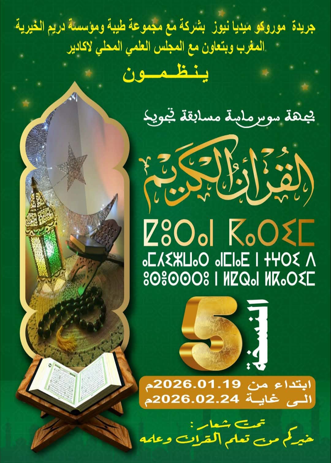 تعلن مؤسسة موروكو ميديا نيوز، بشراكة مع مجموعة طيبة ومؤسسة دريم الخيرية – المغرب، وبتعاون مع المجلس العلمي المحلي لأكادير، عن تنظيم النسخة الخامسة من المسابقة الجهوية لتجويد القرآن الكريم بجهة سوس ماسة، وذلك بعد النجاح الباهر الذي حققته الدورات السابقة.