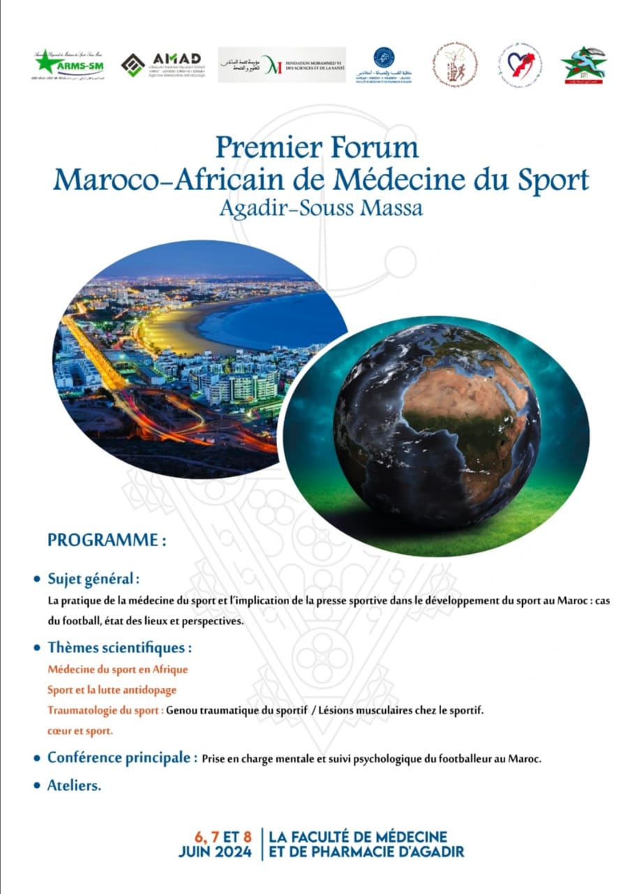أخذا بالإعتبار أن الطب الرياضي هو قاعدة أساسية، بل وحلقة أقوى لتقدم الرياضة بشكل عام، وكرة القدم بشكل خاص، ووعيا باضطراد أهمية الطب الرياضي في الصناعة الرياضية، يأتي انعقاد المنتدى المغربي الأفريقي الأول للطب الرياضي أكادير – سوس ماسة (FMAMS) أيام 6 - 7 - 8 يونيو 2024، بمدينة أكادير، ليكون منصة للنقاش العلمي حول مفاصل مهمة في هذا الإختصاص، وفرصة يجب اغتنامها من أجل التأكيد على الأهمية القصوى للطب الرياضي وتطوره مع مرور الوقت، بالمرور من النمط العلاجي إلى النمط الوقائي، ومن أجل المساهمة في تحسين وتجويد أداء الرياضيين.