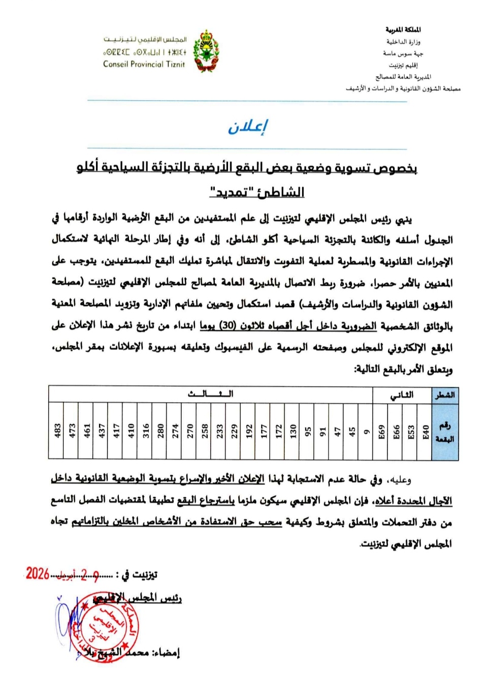 ينهي رئيس المجلس الإقليمي لتيزنيت إلى علم المستفيدين من البقع الأرضية الواردة أرقامها في الجدول أسفله ( الصورة المرفقة) والكائنة بالتجزئة السياحية أكلو الشاطئ إلى أنه وفي إطار المرحلة النهائية لاستكمال الإجراءات القانونية والمسطرية لعملية التفويت والانتقال لمباشرة تمليك البقع للمستفيدين، يتوجب على المعنيين بالأمر حصرا، ضرورة ربط الاتصال بالمديرية العامة لمصالح للمجلس الإقليمي لتيزنيت (مصلحة الشؤون القانونية والدراسات والأرشيف) قصد استكمال وتحيين ملفاتهم الإدارية وتزويد المصلحة المعنية بالوثائق الشخصية الضرورية داخل أجل أقصاه ثلاثون (30) يوما ابتداء من تاريخ نشر هذا الإعلان على الموقع الإلكتروني للمجلس وصفحته الرسمية على الفيسبوك وتعليقه بسبورة الإعلانات بمقر المجلس.