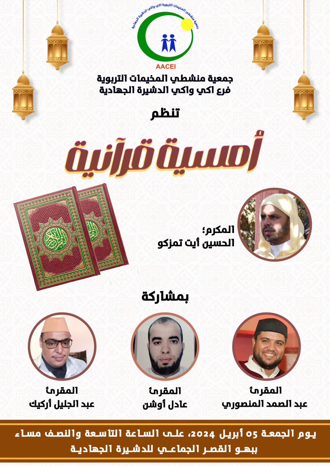 بمناسبة العشر الأواخر من شهر رمضان الفضيل، وفي إطار الأنشطة الإجتماعية والثقافية والإشعاعية لجمعية منشطي المخيمات التربوية فرع إكي واكي الدشيرة الجهادية، سيحتضن رحاب القصر الجماعي للدشيرة الجهادية يوم الجمعة 05 أبريل الجاري امسية قرآنية بهيجة احتفاء بأهل القرآن وخاصته، وسيتخلل برنامج الأمسية مشاركات متميزة لعدد من القراء المتميزين على صعيد المدينة، ويتعلق الأمر بالمقرئ المتميز صاحب الصوت السجي الأستاذ عبد الجليل اركيك والمقرئين عادل اوشن وعبد الصمد المنصوري، فضلا عن مشاركة مجموعة السماع والمديح التي ستمتع الحضور بوصلات عطرة من الأمداح النبوية.