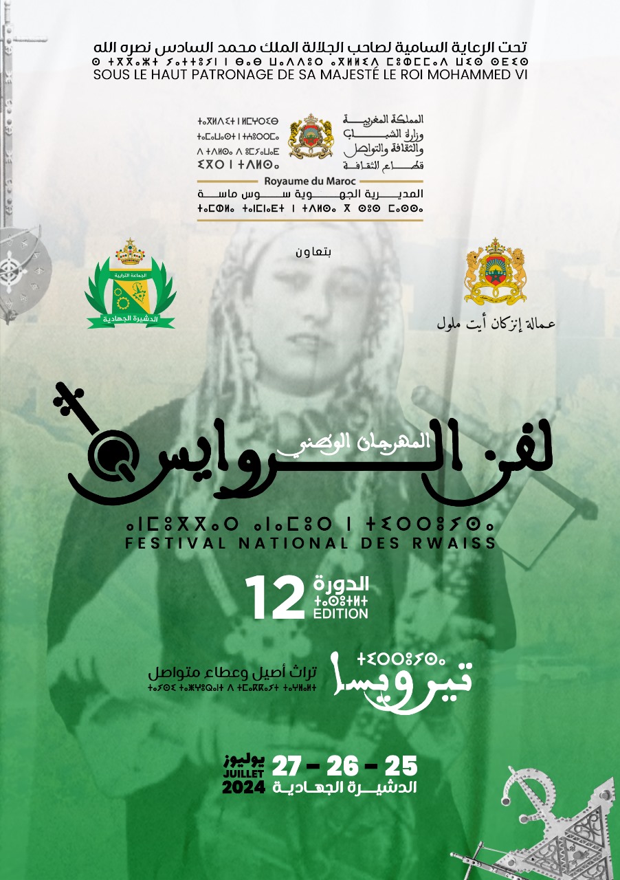 تحت الرعاية السامية لصاحب الجلالة الملك محمد السادس نصره الله، وفي غمرة احتفال الشعب المغربي بالذكرى 25 لعيد العرش المجيد، تنظم وزارة الشباب والثقافة والتواصل – قطاع الثقافة، الدورة 12 للمهرجان الوطني لفن الروايس، أيام 25 و26 و27 يوليوز 2024 بمدينة الدشيرة الجهادية، وذلك بتعاون مع عمالة انزكان أيت ملول والمجلس الجماعي للدشيرة الجهادية.