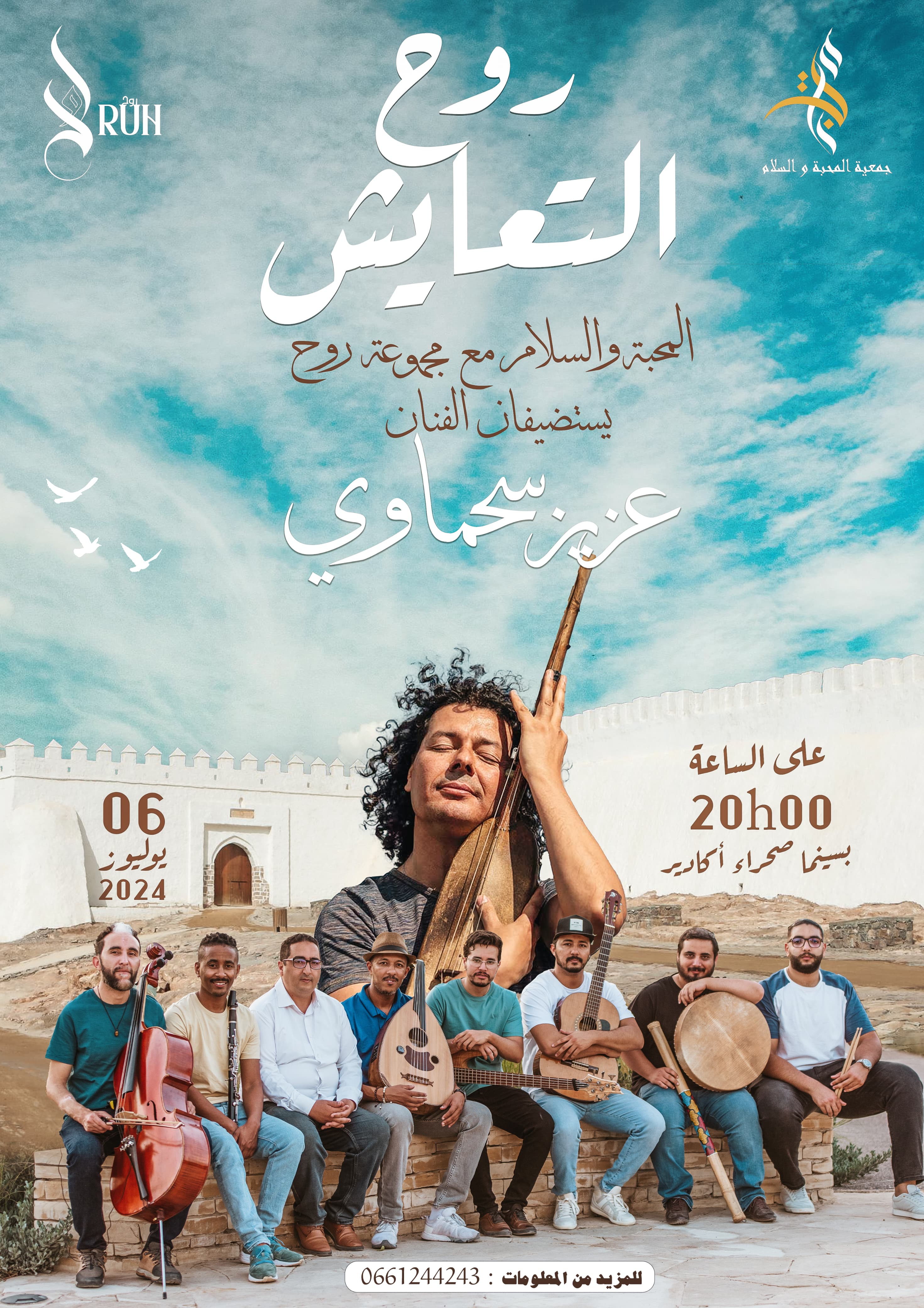 تستعد جمعية المحبة والسلام " أن تستقبل الفنان المغربي والعالمي " *عزيز السحماوي* ، الأديب الفذ، والمغني ، والملحن المتميز، والعازف على مجموعة من الآلات الموسيقية،في حفل ستصحبه المجموعة الموسيقية المبدعة *روح* "، للإشتغال و الإبداع في إقامة فنية استثنائية تُتوَّج بحفل موسيقي يسعى لاسترجاع نغمات الفن الراقي والزمن الجميل .