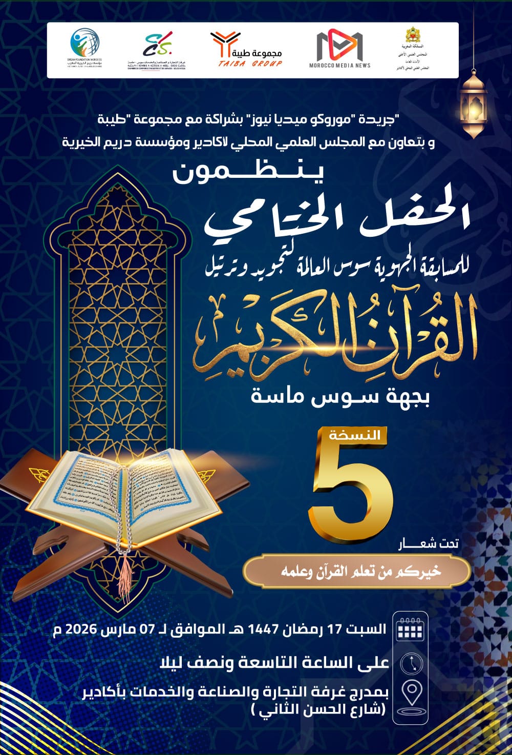 في أجواء إيمانية روحانية، تحتضن جهة سوس ماسة يوم السبت 7 مارس 2026، بمدرج غرفة التجارة والصناعة والخدمات بأكادير، فعاليات الحفل الختامي للمسابقة الجهوية "سوس العالمة" لتجويد وترتيل القرآن الكريم في نسختها الخامسة، وذلك بحضور ثلة من العلماء والقراء والأساتذة وفعاليات تربوية ومدنية وأسر المشاركين.