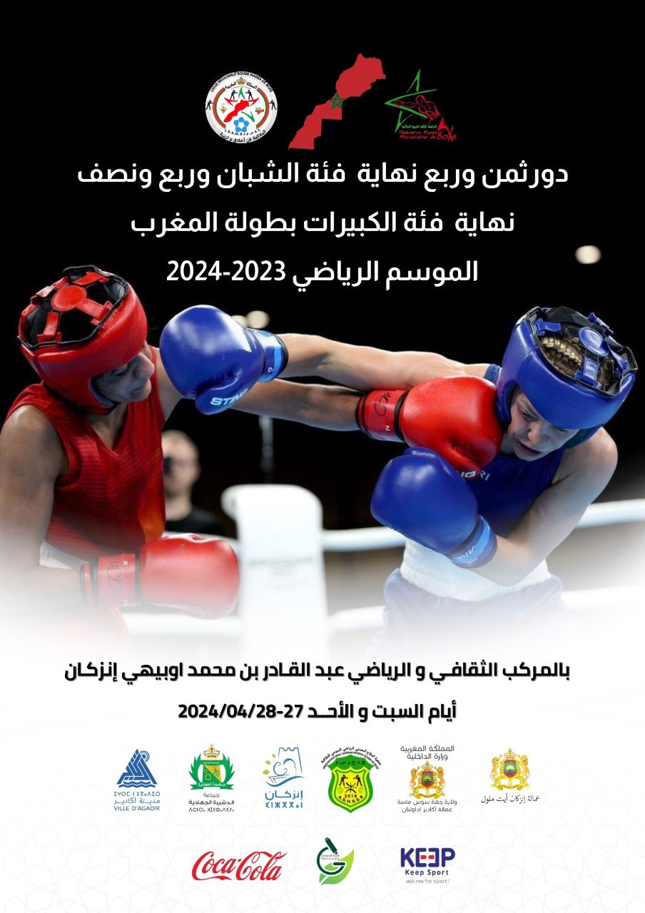تحت إشراف الجامعة الملكية المغربية للملاكمة تنظم عصبة جهة سوس ماسة للملاكمة وبتنسيق مع جمعية الدفاع الحسني الرياضي السوسي للملاكمة والجماعة الترابية لإنزكان الدور ثمن و ربع نهاية البطولة الوطنية لفئة الشبان و ربع و نصف نهاية بطولة المغرب لفئة الكبيرات برسم الموسم الرياضي 2023/2024 وذلك يومي 28/27 أبريل 2024 بالمركب الثقافي عبدالقادر بن محمد أوبيهي بإنزكان.