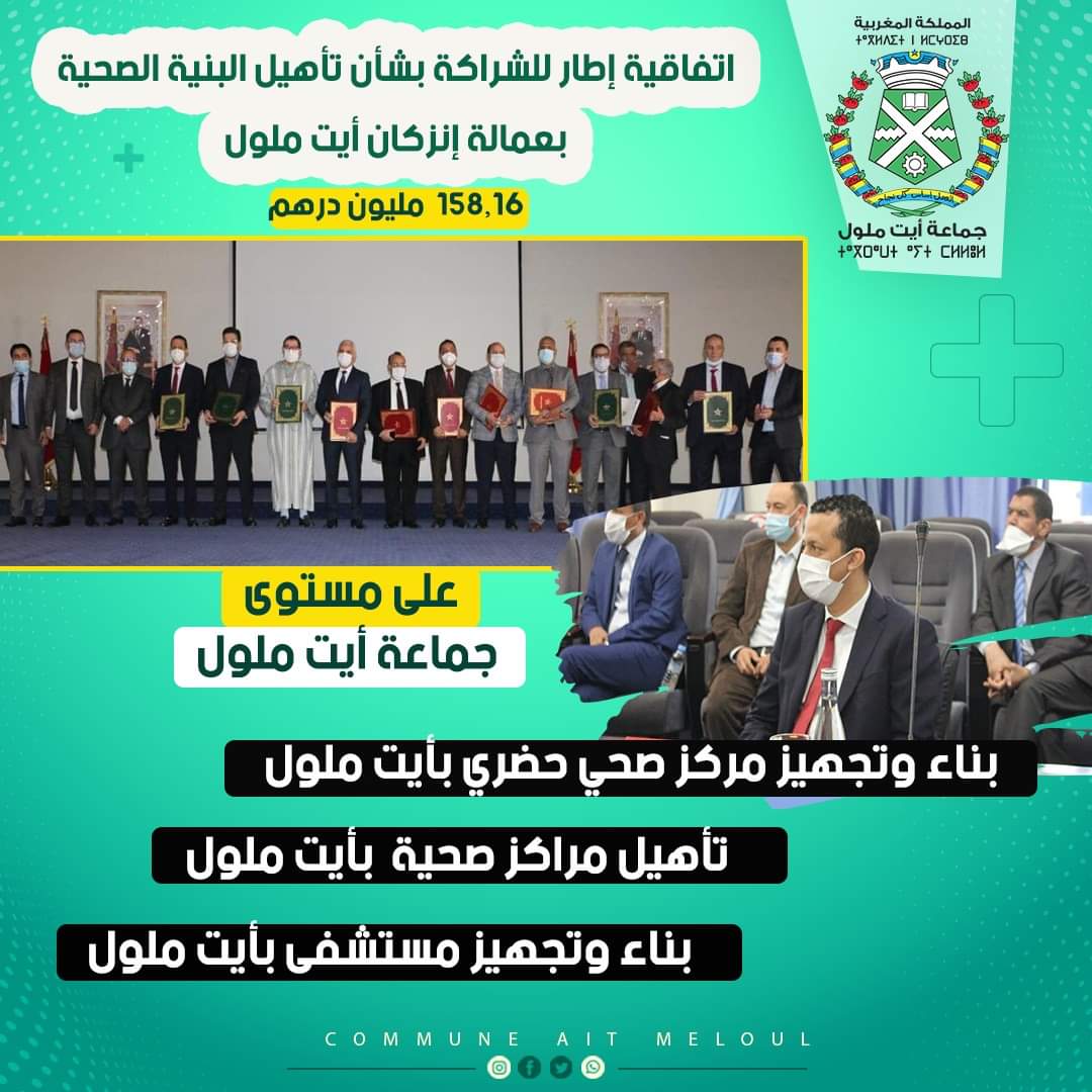 كما تمت عملية إطلاق برنامج تقوية وتهيئة الطرق بأيت ملول على مدى ثلاث سنوات بتكلفة مالية تناهز 15 مليون درهم، تهيئة العشب الطبيعي للملعب البلدي لايت ملول و تخصيص ميزانية خاصة بالتتبع التقني له، الترافع في القطاع الصحي بالمدينة، بحيث استفادت مدينة ايت ملول من البرنامج الحكومي بتوقيع اتفاقية بناء المستشفى الاقليمي بأيت ملول وتهيئة كلية للمركز الصحي لأزرو، بالإضافة إلى استكمال مشروع الحماية من الفيضانات فيما يخص جنبات واحد سوس ومشروع تقوية صبيب المياه و الاستفادة المياه العادمة l’eaux usées،