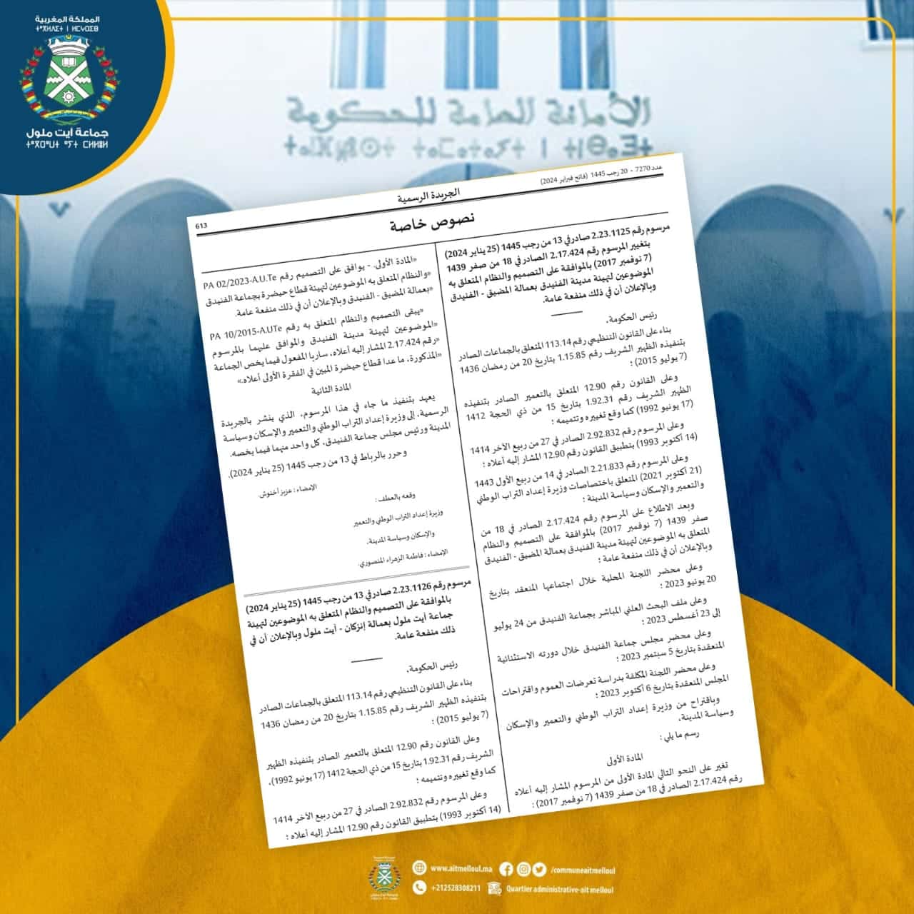 نجح المجلس الجماعي الحالي لأيت ملول، ولأول مرة في تاريخ الجماعة منذ احداثها سنة 1975، في إخراج وثيقة تصميم تهيئة المدينة، حيث صدر بالجريدة الرسمية عدد 7270 بتاريخ (فاتح فبراير 2024) المرسوم رقم 2.23.1126الصادر في 13 من رجب 1445 (25 يناير 2024) بالموافقة على التصميم والنظام المتعلق به الموضوعين لتهيئة جماعة أيت ملول بعمالة انزكان – أيت ملول والإعلان أن في ذلك منفعة عامة.