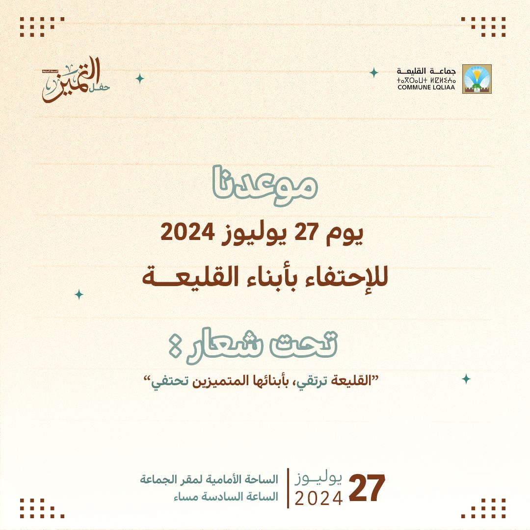 تخليذا لدكرى عيد العرش المجيد و تحت شعار “القليعة ترتقي . بأبنائها المتميزين تختفي ”، تنظم جماعة القليعة الدورة السابعة لحفل التميز ، للموسم الدراسي 2023-2024؛ يوم 27 يوليوز 2024 و ذلك انخراطا في حفز التفوق الدراسي و الثقافي و الرياضي وخلق جيل مفعم بالحياة والانفتاح على المحيط الخارجي.