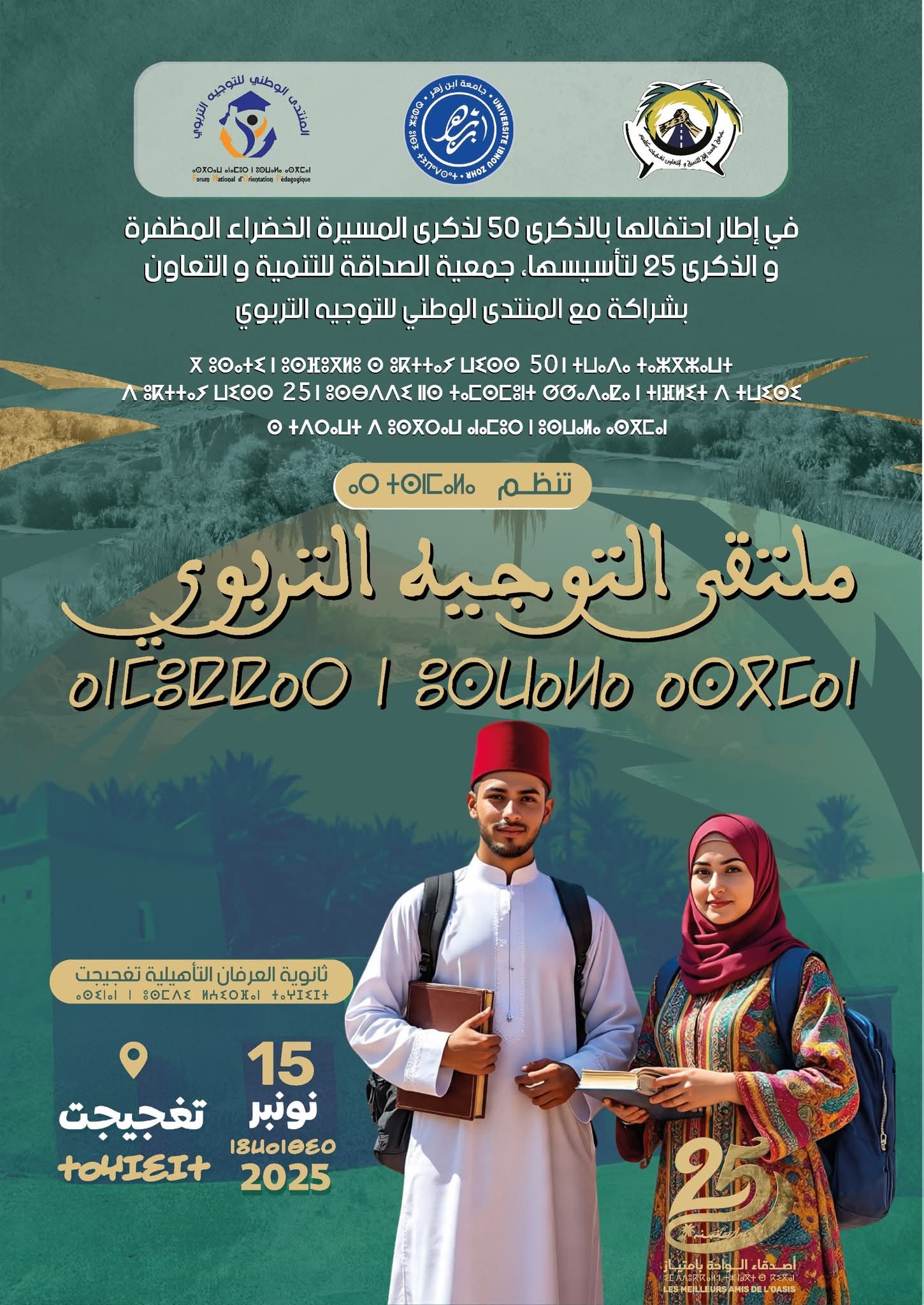 في إطار احتفالها بالذكرى الخمسين للمسيرة الخضراء المظفرة، والذكرى الخامسة والعشرين لتأسيسها، تنظم جمعية الصداقة للتنمية والتعاون بشراكة مع المنتدى الوطني للتوجيه التربوي، ملتقى التوجيه التربوي، وذلك يوم السبت 15 نونبر الجاري على الساعة الثالثة بعد الزوال (15:00)، بفضاء ثانوية العرفان التأهيلية بتغجيجت.