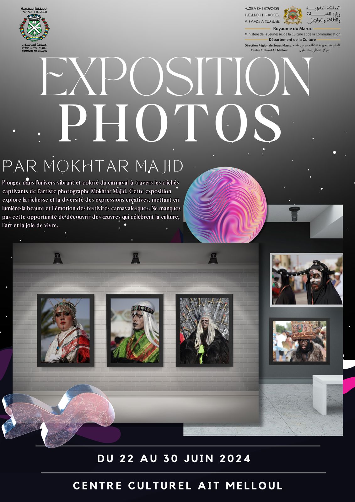 يقيم الإعلامي والمصور الصحفي الفوتوغرافي “مختار ماجيد ” معرضا للصور الفوتوغرافية التنكرية في الفترة الممتدة ما بين 22 الي 30 يونيو من هذه السنة 2024 بقاعة المركب الثقافي بمدينة أيت ملول