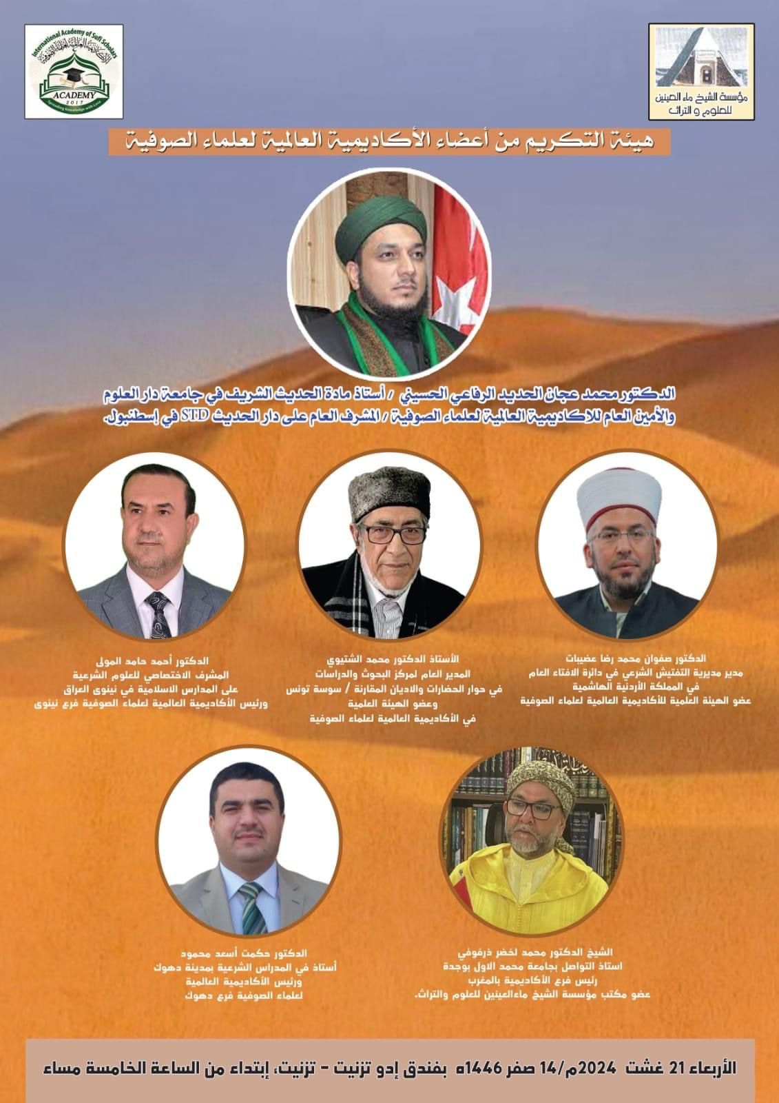 مؤسسة الشيخ ماءالعينين للعلوم والتراث ،و الأكاديمية العالمية لعلماء الصوفية يصنعان الحدث بمناسبة إحتفالات المغرب بأعياده الوطنية الخالدة ،وبالموازاة مع انعقاد الموسم السنوي( للعالم النحرير) الشيخ ماءالعينين ، وذلك بإستضافة المؤسسة لمراسيم حفل تسليم الشهادة العالمية العليا الصادرة عن الأكاديمية والموقعة من 22 جامعة دولية ومؤسسة علمية أكاديمية تنتسب الى 16 دولة ، في نسختها الأولى للعلامة المغربي القاضي: الشيخ لاراباس الشيخ ماءالعينين ، وذلك بقاعة الندوات بفندق "إدو تزنيت" بمدينة تزنيت ،وذلك يوم الاربعاء 21 غشت 2024 بداية من الساعة الخامسة الى الساعة السابعة و النصف .