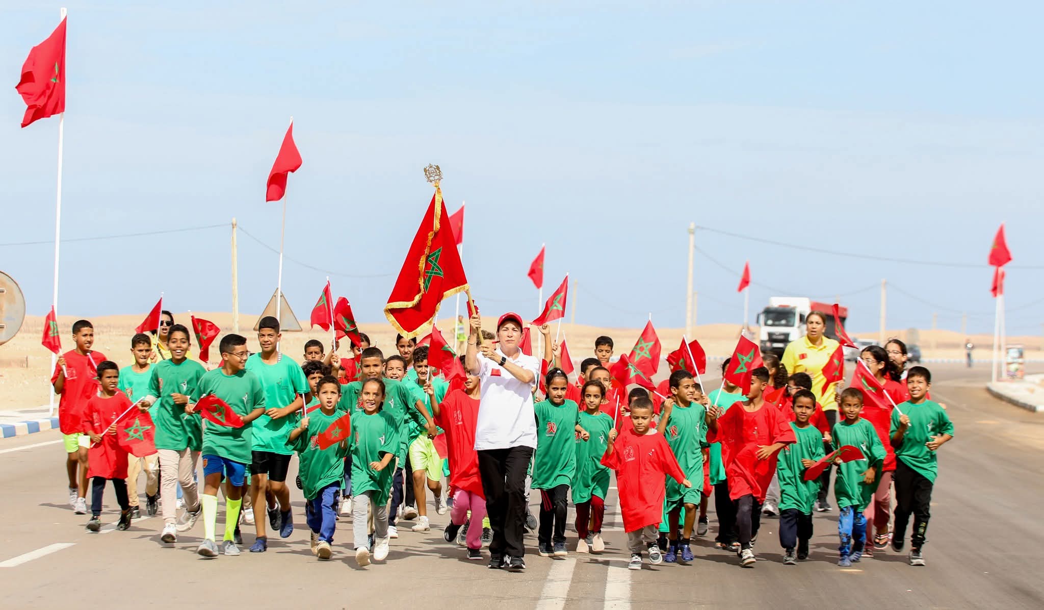 وكان هؤلا التلاميذ والتلميذات في قمة البهجة والسرور حينما رافقوا حاملة العلم الوطني في المرحلة ال 12 الرابطة بين طرفاية والعيون، البطلة العالمية زهرة وعزيز، وركضوا إلى جانبها بعض مئات الأمتار وأخذوا صورا تذكارية مع رئيسة الجامعة الملكية المغربية للرياضة للجميع، السيدة نزهة بدوان ، وأعضاء المكتب المديري للجامعة وطاقميها الإداري والتقني .