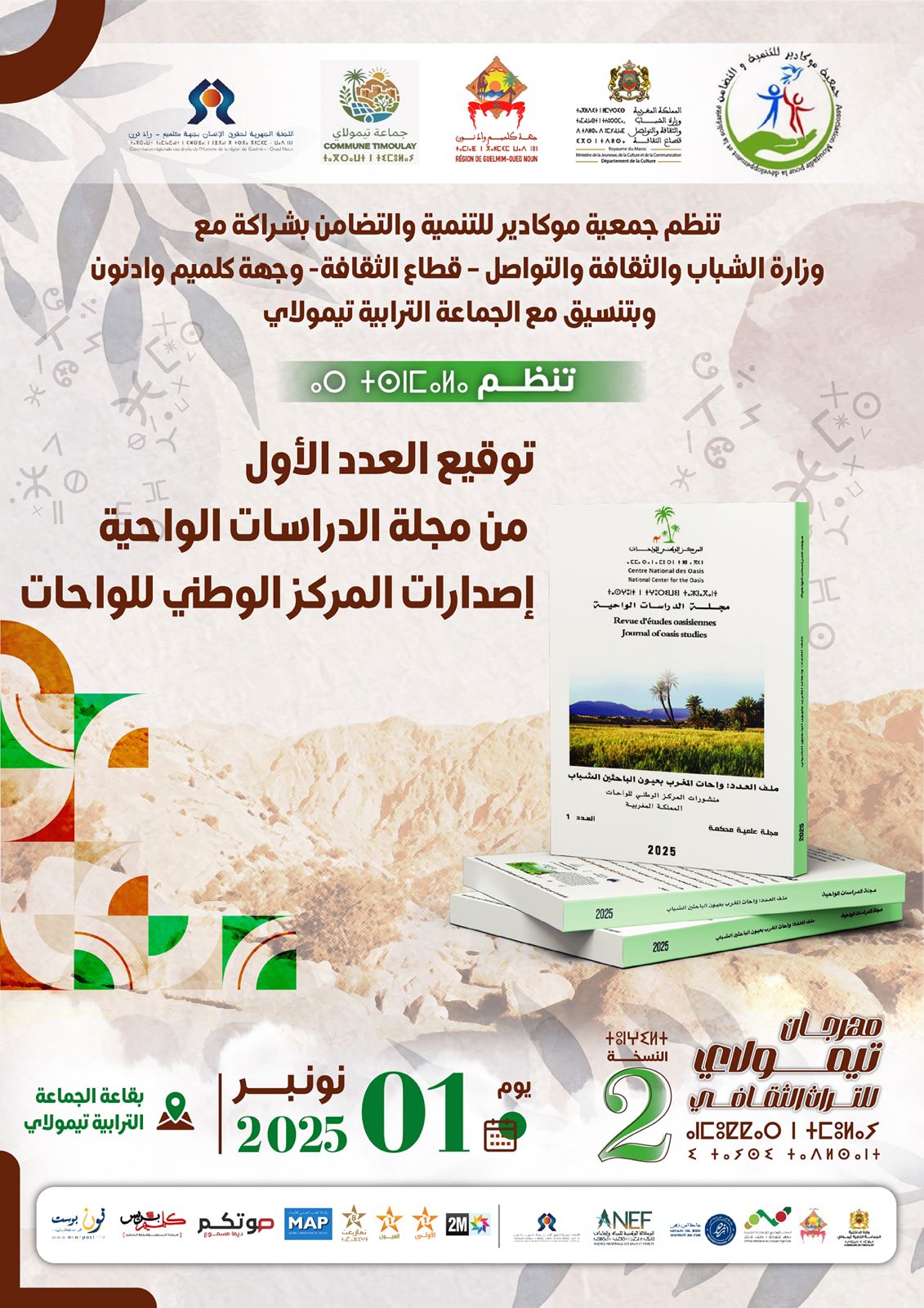 تنظم جمعية موكادير للتنمية والتضامن بدعم من المديرية الجهوية لوزارة الشباب والثقافة والتواصل ( قطاع الثقافة) وجهة كلميم وادنون، وبتعاون مع مجلس جماعة تيمولاي والمديرية الإقليمية للتربية الوطنية والتعليم الأولي بكلميم واللجنة الجهوية لحقوق الإنسان كلميم وادنون، فعاليات الدورة الثانية من مهرجان تيمولاي للتراث الثقافي، وذلك في الفترة ما بين 31 أكتوبر و 10 029 نونبر 2025 بجماعة تيمولاي.