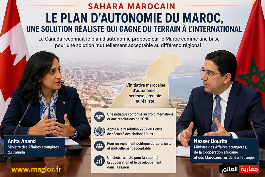 Maglor – Le soutien international en faveur du plan d’autonomie proposé par le Maroc pour le Sahara ne cesse de se renforcer. Dernier en date, le Canada a reconnu cette initiative comme une base crédible pour parvenir à une solution mutuellement acceptable, confirmant ainsi une dynamique diplomatique de plus en plus favorable à Rabat.