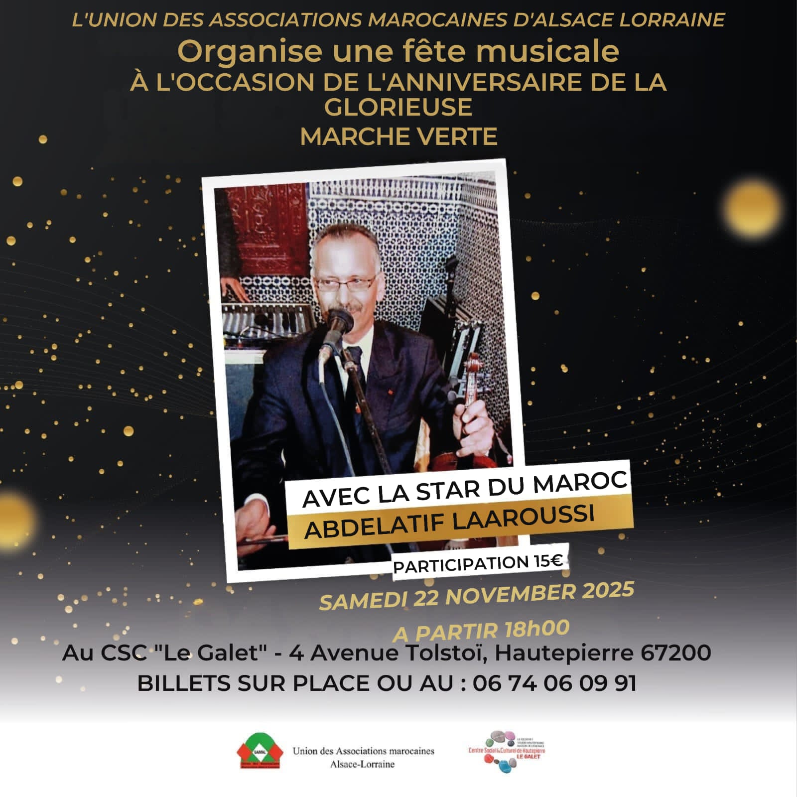 Maglor - À l’occasion de l’anniversaire de la Glorieuse Marche Verte, l’Union des Associations Marocaines d’Alsace Lorraine organise une grande fête musicale destinée à rassembler la communauté marocaine et ses amis autour d’un moment de convivialité, de culture et de commémoration nationale.