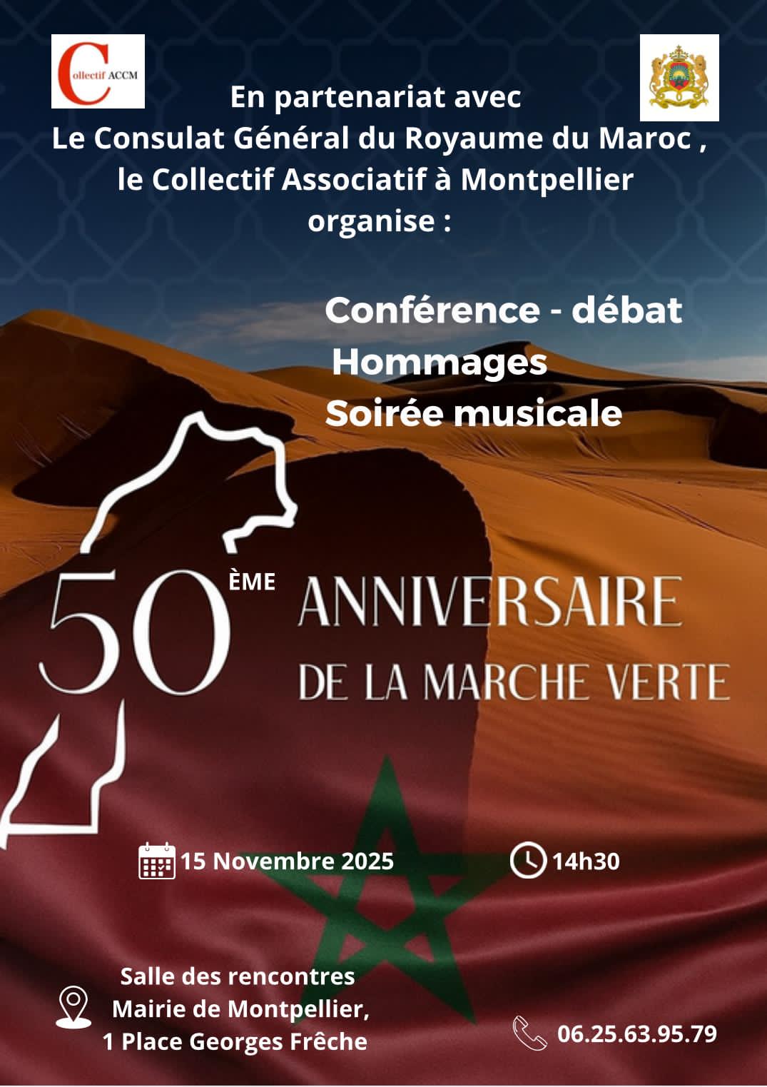 Maglor - À l’occasion du cinquantenaire de la Marche Verte, le Collectif des Marocains ACCM, en partenariat avec le Consulat Général du Royaume du Maroc à Montpellier, organise une célébration patriotique et culturelle le 15 novembre 2025, à la salle des Rencontres de l’Hôtel de Ville de Montpellier.