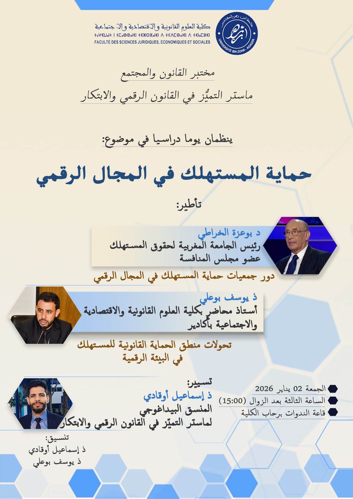 نظّمت كلية العلوم القانونية والاقتصادية والاجتماعية بجامعة ابن زهر بأكادير، في إطار أنشطة مختبر القانون والمجتمع وماستر التميز في القانون الرقمي والابتكار، يومًا دراسيًا حول موضوع “حماية المستهلك في المجال الرقمي”، وذلك يوم السبت 02 يناير 2026 بقاعة الندوات برحاب الكلية.