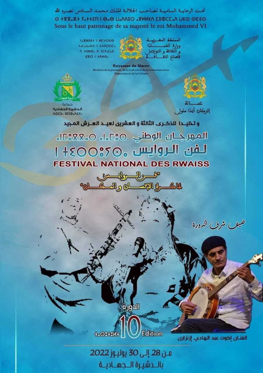 تحت الرعاية السامية لصاحب الجلالة الملك محمد السادس نصره الله، وفي إطار الاهتمام الذي توليه وزارة الشباب والثقافة والتواصل لمختلف مظاهر التراث غير المادي ببلادنا، واستمرارا لسعيها الدؤوب للنهوض بالفنون التراثية المغربية، تنظم وزارة الشباب والثقافة والتواصل- قطاع الثقافة – الدورة 10 للمهرجان الوطني لفن الروايس أيام 28 و29 و30 يوليوز 2022 بمدينة الدشيرة الجهادية، وذلك بتعاون مع عمالة إنزكان أيت ملول والمجلس الجماعي للدشيرة الجهادية.
