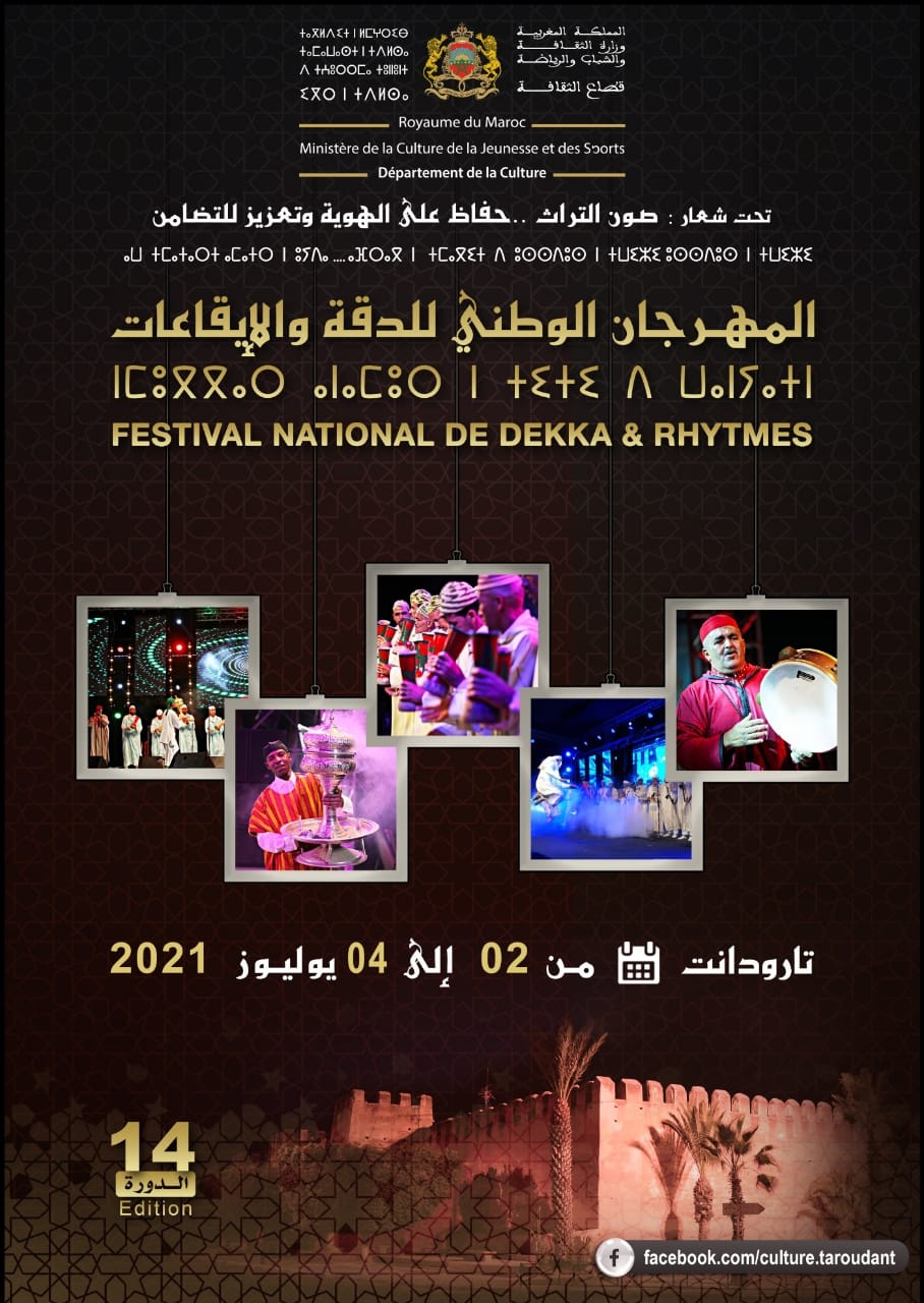 في إطار الجهود الرامية إلى صون الموروث الثقافي اللامادي الأصيل ومن أجل إيلاء مزيد من العناية والاهتمام بممارسيه من خلال اكتشاف أبرز العروض الفنية لفن الدقة والإيقاعات الفنية المجاورة الأخرى، وللحفاظ على هذا التنوع والتعدد وحسن تثمين واستثمار مكوناته سعيا لإبراز مقومات الهوية الثقافية الوطنية ووحدتها، ستنظم عن بعد الدورة الرابعة عشر للمهرجان الوطني للدقة والايقاعات بتارودانت أيام 02، 03 و04 يوليوز 2021 تحت شعار: "صون التراث ... حفاظ على الهوية وتعزيز للتضامن"
