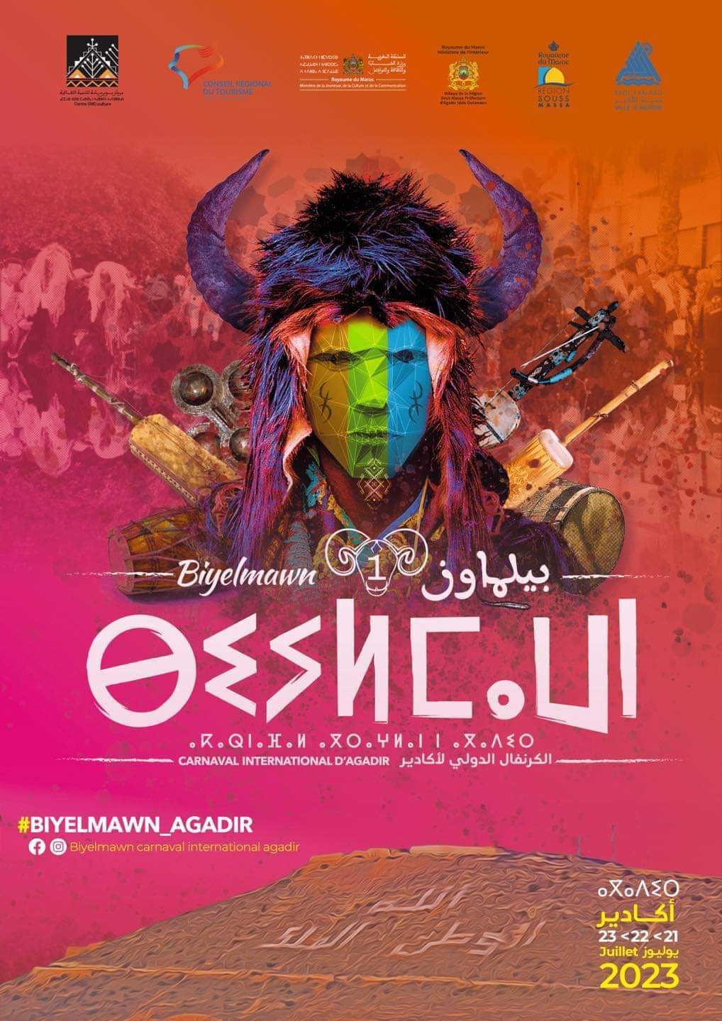 بمبادرة من مجلس جماعة اكادير. وتنزيلا لبرنامج عمل الجماعة 2022 - 2027، وبدعم من وزارة الشباب والثقافة والتواصل ومجلس جهة سوس ماسة، ومن تنظيم مركز سوس ماسة للتنمية الثقافية تعلن إدارة بيلماون: الكرنفال الدولي الأكادير عن تنظيم الدورة الأولى لهذا الملتقى الاحتفالي الدولي في دورته الأولى بمختلف فضاءات مدينة اكادير، ترجمة لممارسة ثقافية متجذرة في جهة سوس ماسة خاصة والمغرب عامة في ارتباط مع عيد الأضحى المبارك وذلك أيام 23/22/21 يوليوز 2023. تعرف هذه الدورة الأولى مشاركة فرق التراث الشعبي المغربي الى جانب فرق شخوص بيلماون بأقلعتها وأزيائها التنكرية، والممثلة لجمعيات أكادير الكبير، علاوة على المجسمات الإبداعية، الشيء الذي يترجم انخراط الجميع في لوحات شيقة، تتخللها مسابقة للمجموعات الكرنفالية للظفر بجوائز أفضل العروض. تستلهم الدورة الأولى لهذه الفرجة الجماعية تأسيسها من حرص القائمين على الشأن المحلي بالمدينة والجهة على الحفاظ على الموروث الثقافي الأمازيغي لبلادنا وتقويته باعتباره هوية مشتركة لجميع المغاربة، والتي تجد أرضية خصبة في مجال سوس وأكادير مدينة الانبعاث وعاصمة الثقافة الامازيغية.