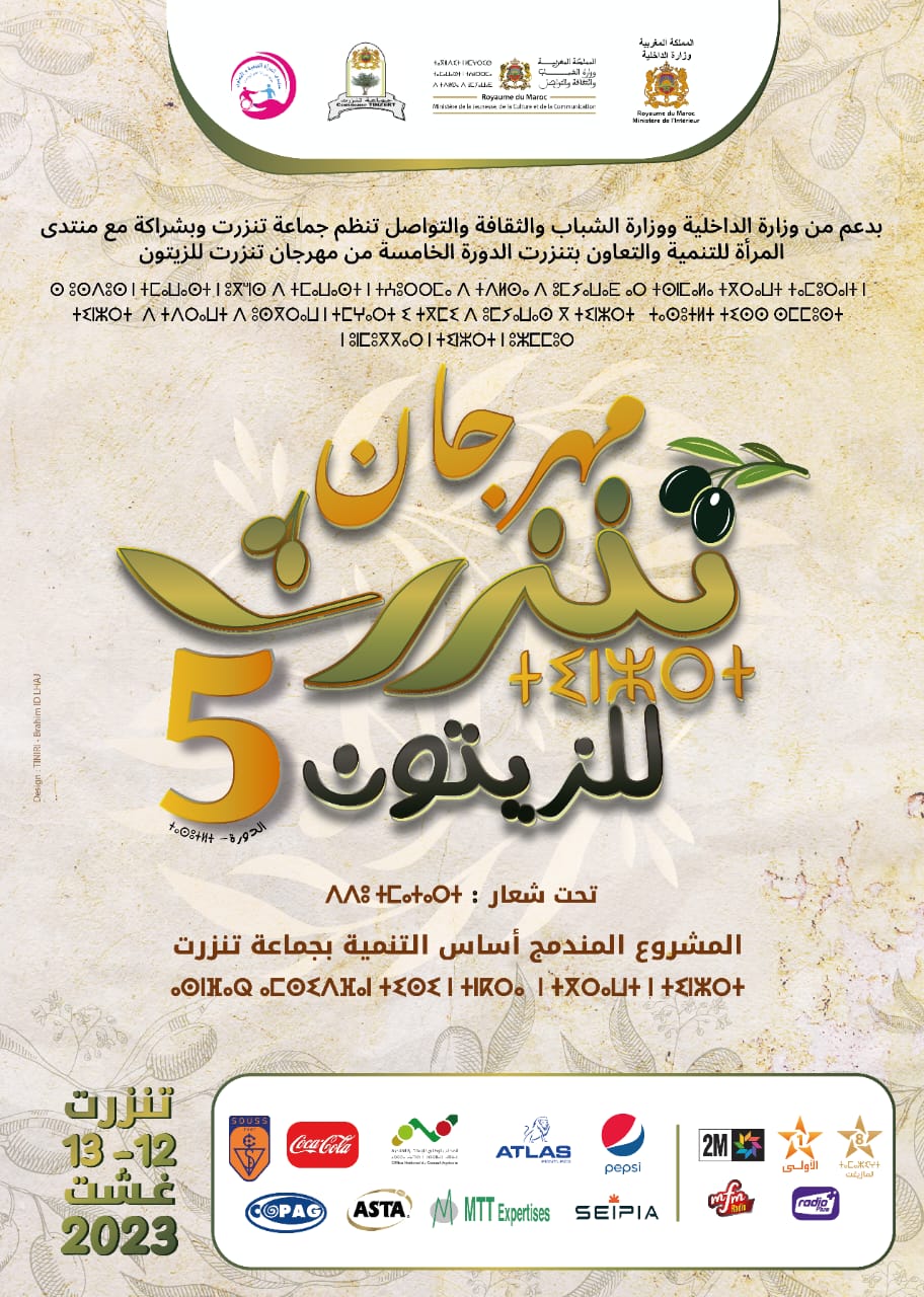 بدعم من وزارة الداخلية ووزارة الشباب والثقافة والتواصل وتحت شعار: “المشروع المندمج أساس التنمية بجماعة تنزرت“، تحتضن تنزرت بإقليم تارودانت يومي 12 و 13 من غشت الجاري، الدورة الخامسة من مهرجان تنزرت للزيتون، تظاهرة تقف وراء تنظيمها الجماعة ومنتدى المرأة للتنمية والتعاون بتنزرت، بمساهمة و انخراط مجموعة من الفاعلين المحليين والوطنيين.