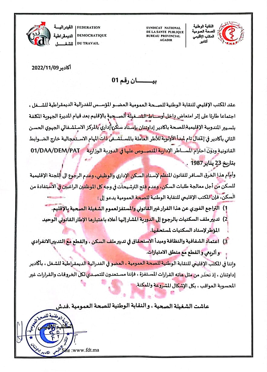 عقد المكتب الإقليمي للنقابة الوطنية للصحة العمومية العضو المؤسس للفدرالية الديمقراطية للشغل ، اجتماعا طارئا على إثر امتعاض داخل أوساط الشغيلة الصحية بالإقليم بعد قيام المديرة الجهوية المكلفة بتسيير المندوبية الإقليمية للصحة باكادير إداوتنان بإسناد سكن إداري بالمركز الاستشفائي الجهوي الحسن الثاني بأكادير في إغفال تام لمبدأ الأولوية للأطر العاملة بالمستشفى ذات المهام الاستعجالية خارج الضوابط القانونية ودون احترام المساطر الإدارية المنصوص عليها في الدورية الوزارية 01/DAA/DEM/PAT بتاريخ 23 يناير 1987.