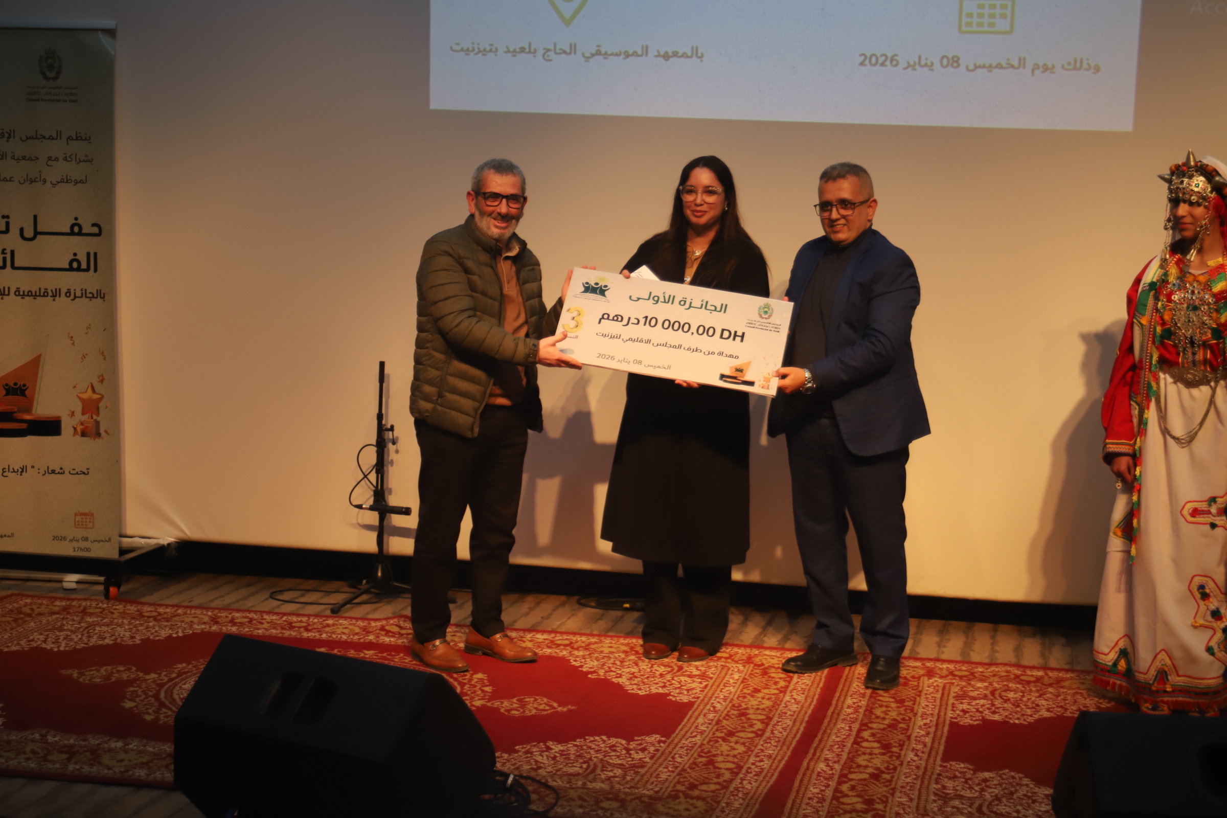 في اطار جهوده الرامية الى تثمين الراسمال البشري ودعم الطاقات الابداعية، نظم المجلس الاقليمي لتيزنيت، بشراكة مع جمعية الاعمال الاجتماعية لموظفي واعوان عمالة اقليم تيزنيت، مساء يوم الخميس 8 يناير 2026، بالمعهد المحلي للموسيقى والفن الكوريغرافي الرايس الحاج بلعيد بمدينة تيزنيت، حفل تتويج الفائزين في النسخة الثالثة من الجائزة الاقليمية للابداع والابتكار، المنظمة تحت شعار "الابداع هوية وتميز".