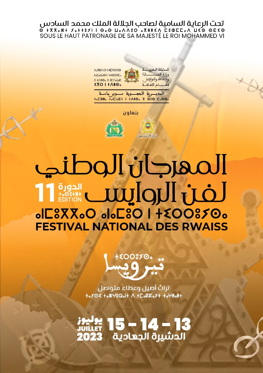 تحت الرعاية السامية لصاحب الجلالة الملك محمد السادس نصره الله، تنظم وزارة الشباب والثقافة والتواصل – قطاع الثقافة، بتعاون مع عمالة انزكان ايت ملول والمجلس الجماعي للدشيرة الجهادية، الدورة 11 للمهرجان الوطني لفن الروايس، أيام 13 و14 و15 يوليوز 2023 بمدينة الدشيرة الجهادية.