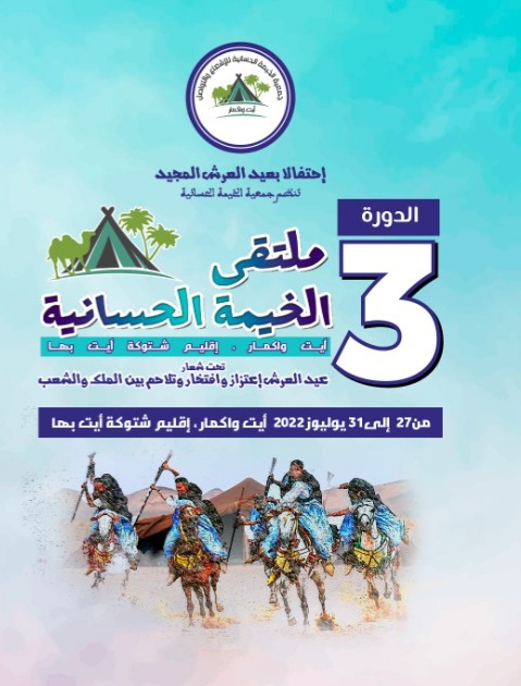 في إطار الاحتفالات بعيد العرش المجيد، تستعد جمعية ” الخيمة الحسانية ” لإقامة فعاليات النسخة الثالثة من ملتقى الخيمة الحسانية خلال الفترة الممتدة من 27 إلى 31 يوليوز الجاري ب ” أيت واكمار ” وادي الصفا، إقليم اشتوكة أيت باها.