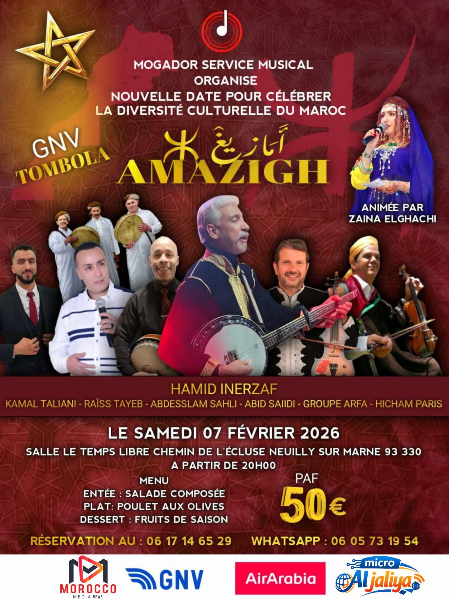 في إطار الاحتفال برأس السنة الأمازيغية، ينظم Mogador Service Musical حفلاً فنياً مميزاً يكرّس قيم التنوع الثقافي المغربي ويبرز غنى الموروث الأمازيغي، وذلك يوم السبت 7 فبراير 2026 بقاعة Le Temps Libre بمدينة نويي سور مارن (Neuilly-sur-Marne) بفرنسا.