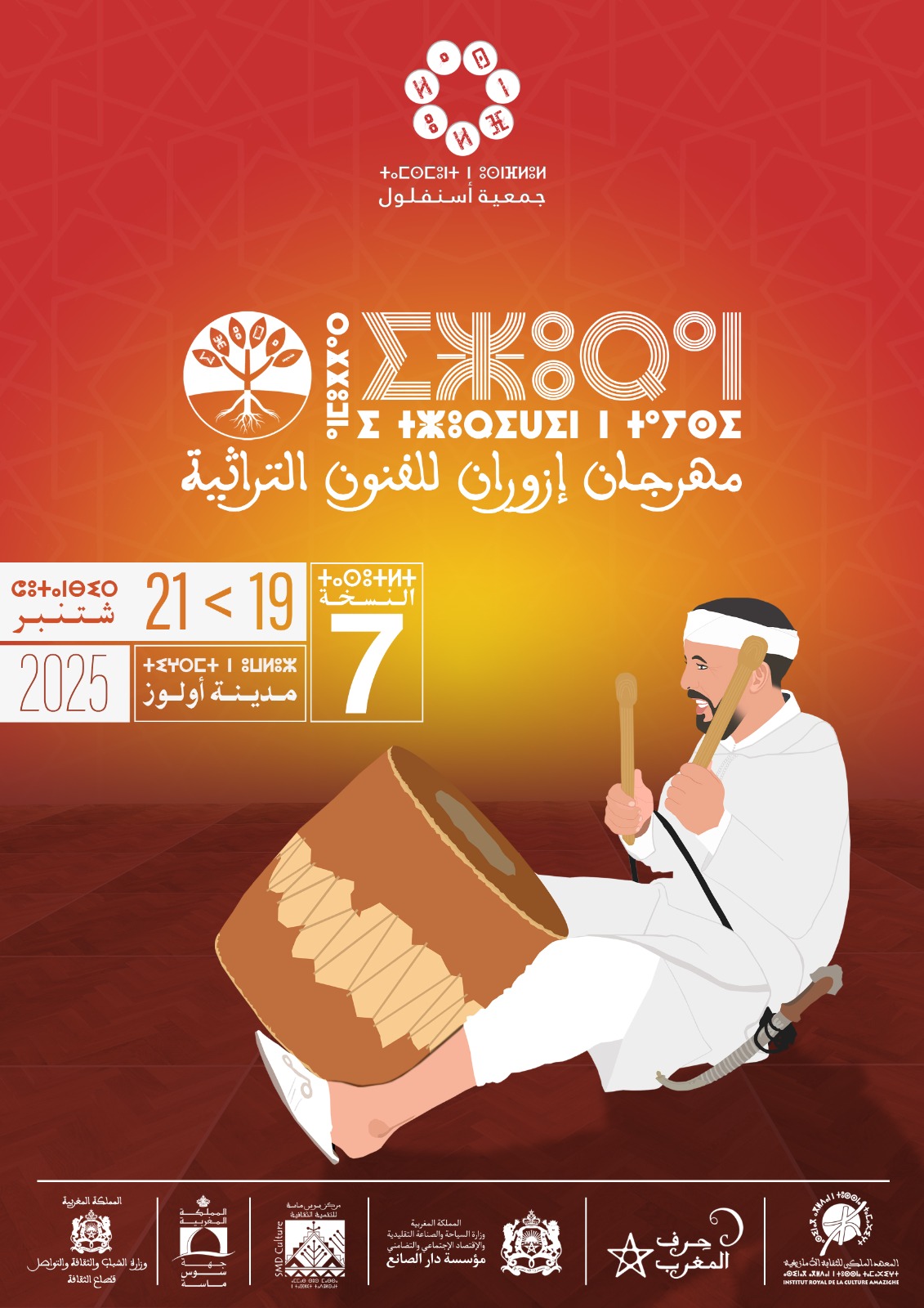 تستعد جمعية اسنفلول للثقافة والبيئة والتضامن، بشراكة مع المعهد الملكي للثقافة الأمازيغية، وبدعم من مؤسسة دار الصانع ووزارة الشباب والثقافة والتواصل – قطاع الثقافة، ومجلس جهة سوس ماسة ومركز سوس ماسة للتنمية الثقافية، إلى جانب عدد من الشركاء المؤسساتيين والخواص، لتنظيم الدورة السابعة من مهرجان إزوران للفنون التراثية، وذلك خلال الفترة الممتدة من 19 إلى 21 شتنبر 2025 بمدينة أولوز، إقليم تارودانت.