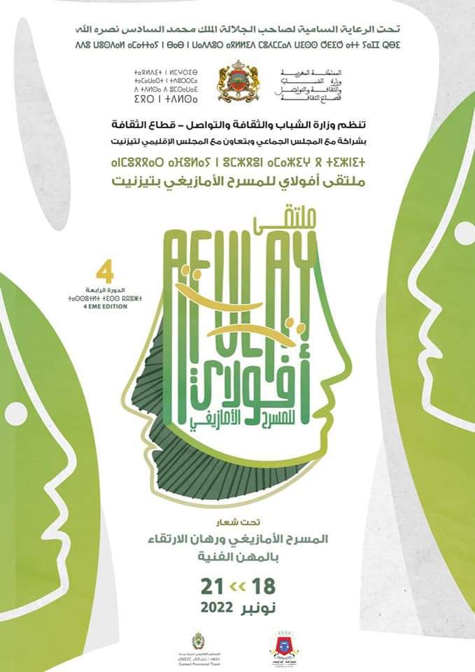 تحت الرعاية السامية لصاحب الجلالة الملك محمد السادس نصره الله، وبمناسبة الذكرى 67 لعيد الاستقلال المجيد، تنظم وزارة الشباب والثقافة والتواصـل - قطـاع الثقافـة - مـن 18 إلى 21 نونبر 2022 الـدورة الرابعة لملتقى أفـولاي للمسرح الأمازيغي بمدينة تيزنيت، تحت شعار المسرح الأمازيغي ورهان الارتقاء بالمهن الفنية".
