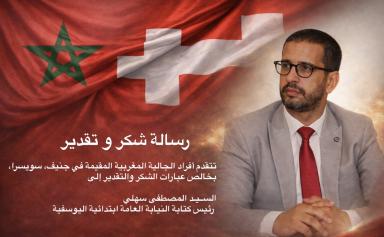 بقلوب يملؤها التقدير والاعتراف بالجميل، تتقدم أفراد الجالية المغربية بمدينة جنيف، سويسرا، بأسمى عبارات…
