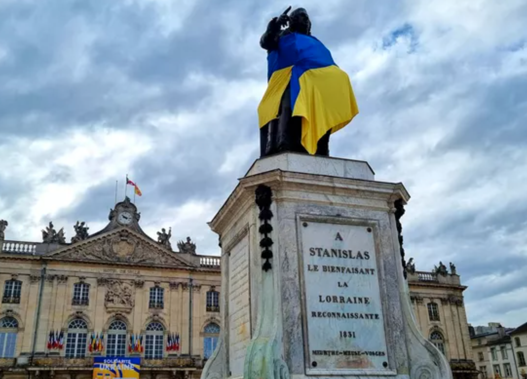 Depuis plus d'un mois, la statue de Stanislas Leszczynski à Nancy porte le drapeau ukrainien sur ses épaules.