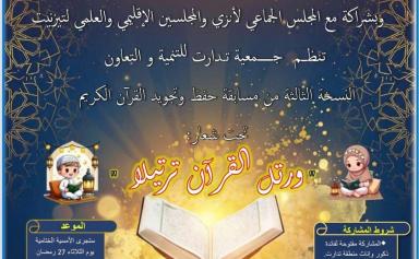 بمناسبة شهر رمضان المبارك لعام 1447 هـ / 2026 م، تنظم جمعية تدارت للتنمية والتعاون النسخة الثالثة من مسابقة في حفظ وتجويد القرآن الكريم، وذلك…